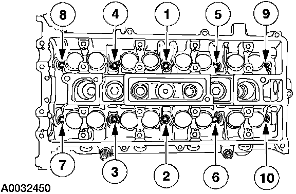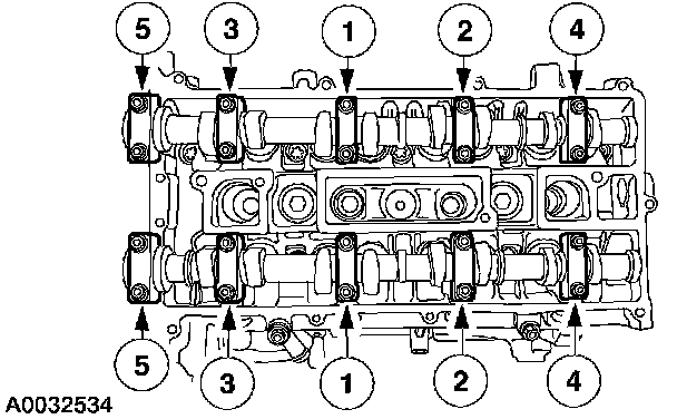 Stage 1 Tighten the camshaft bearing bolt caps one turn at a time until tight.