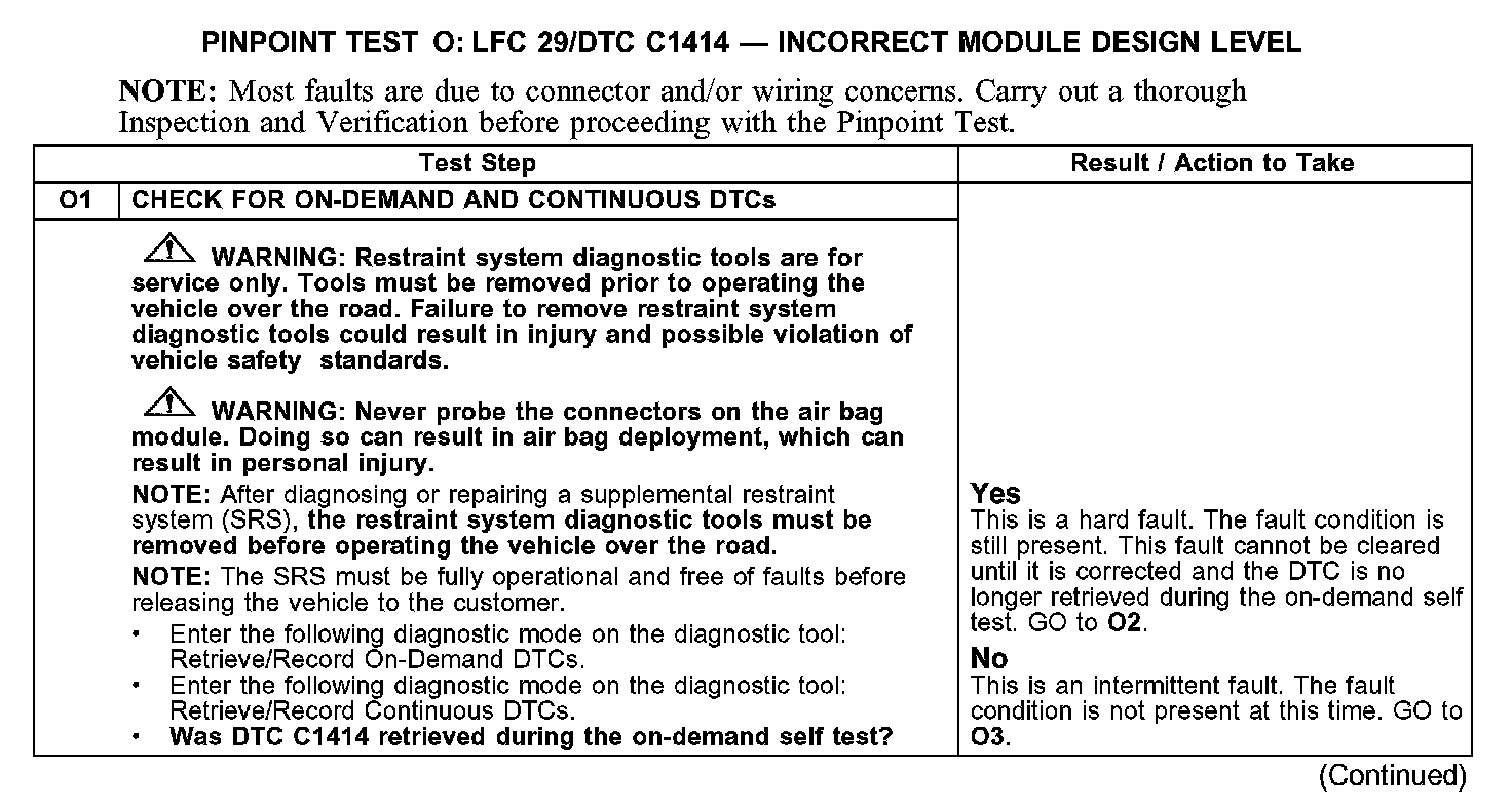PINPOINT TEST O: LFC 29/DTC C1414 - INCORRECT MODULE DESIGN LEVELO1: