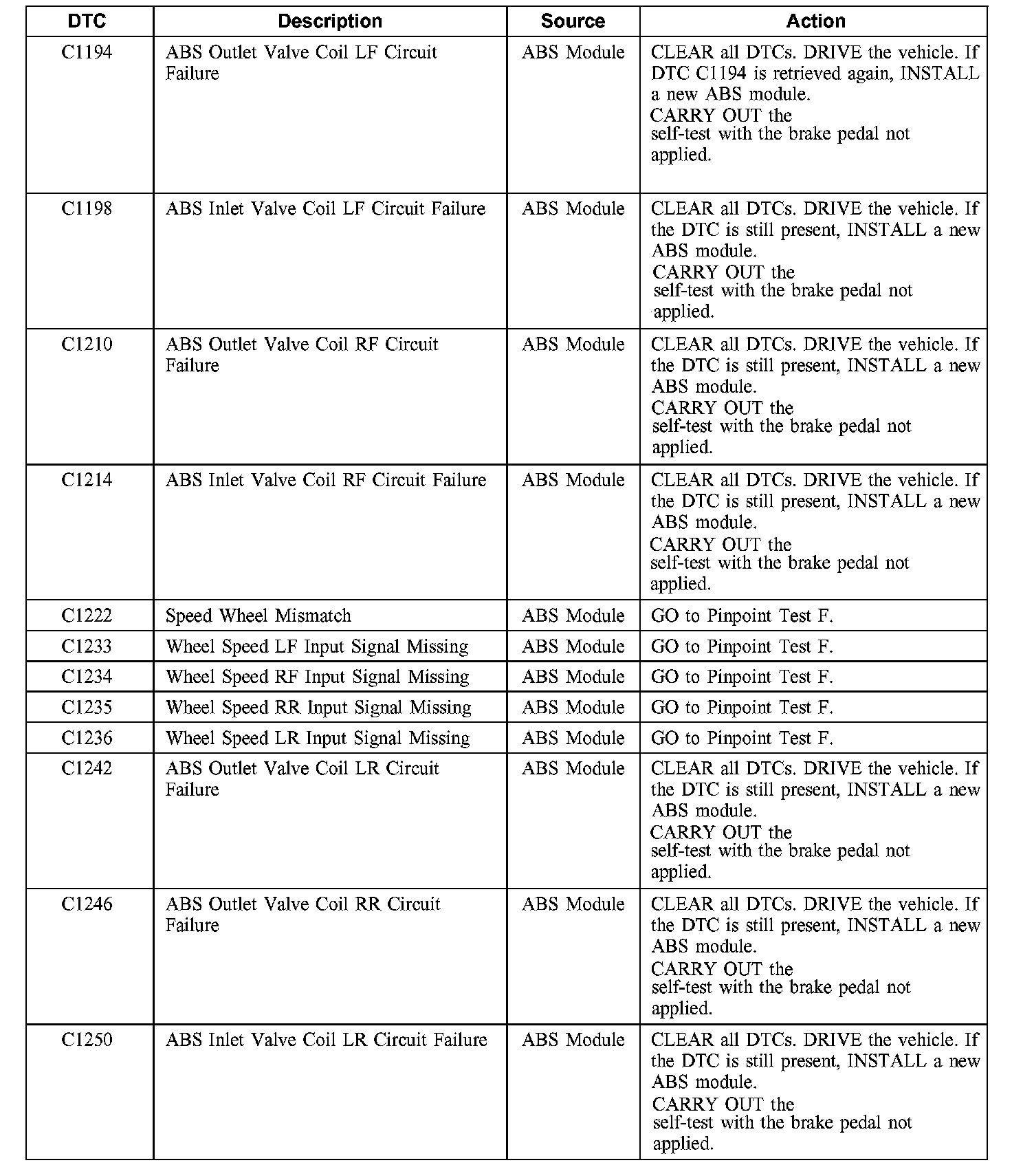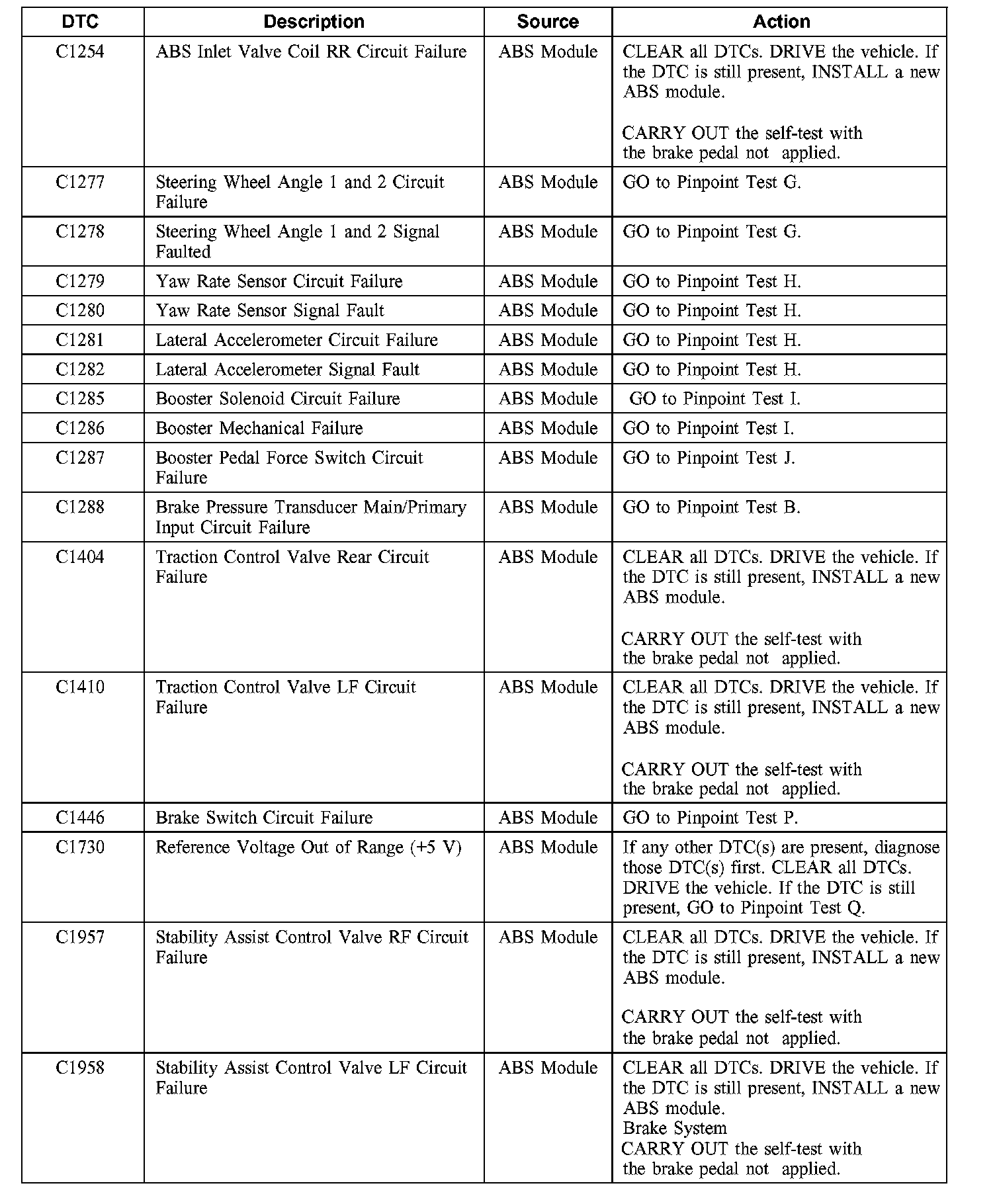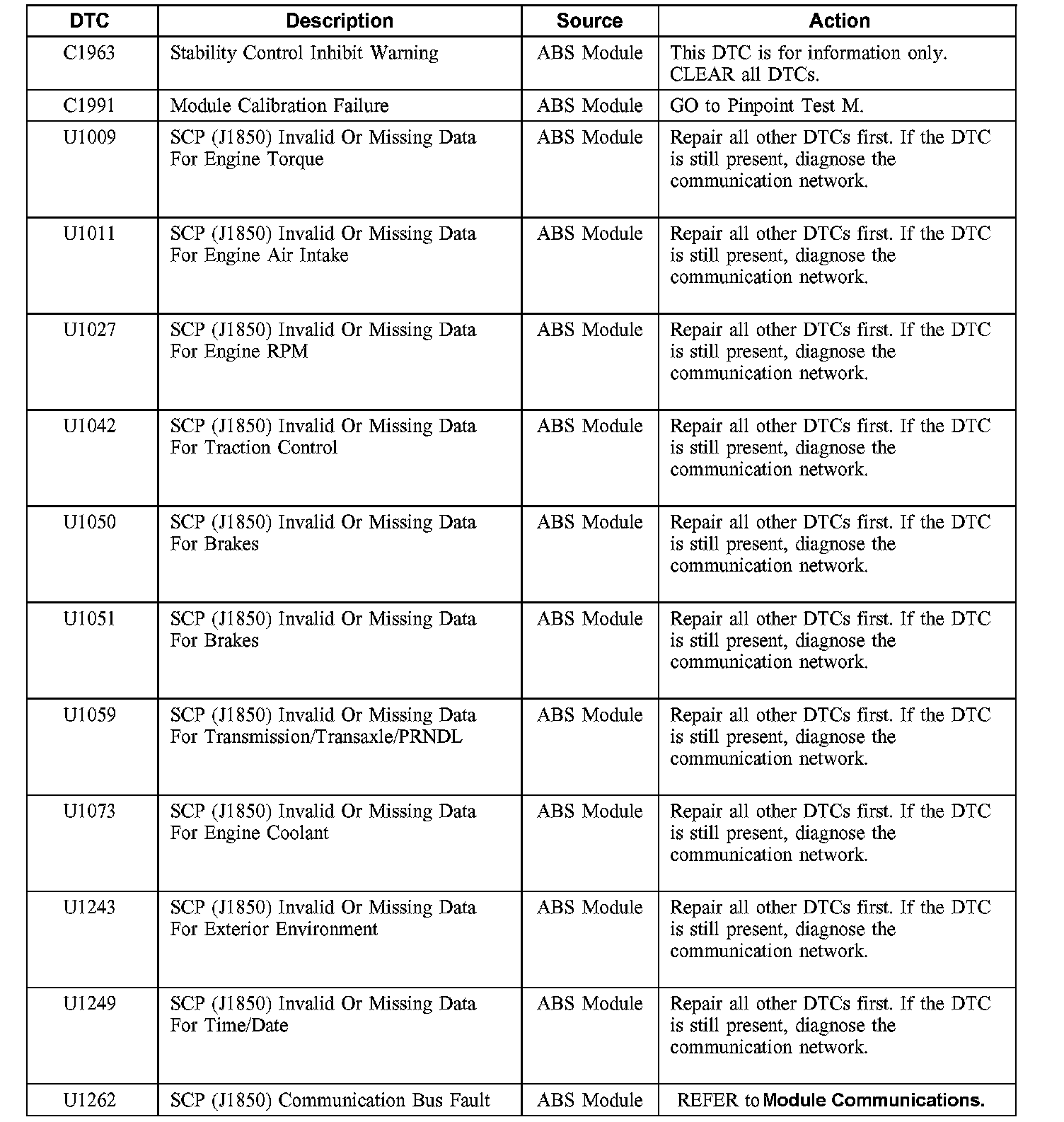 Anti-Lock Brake System (ABS) Module Diagnostic Trouble Code (DTC) Index
