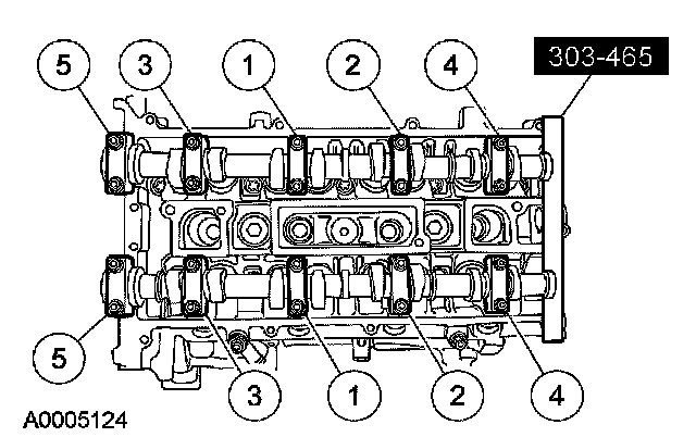 Stage 1: Tighten the camshaft bearing cap bolts one turn at a time until finger tight.