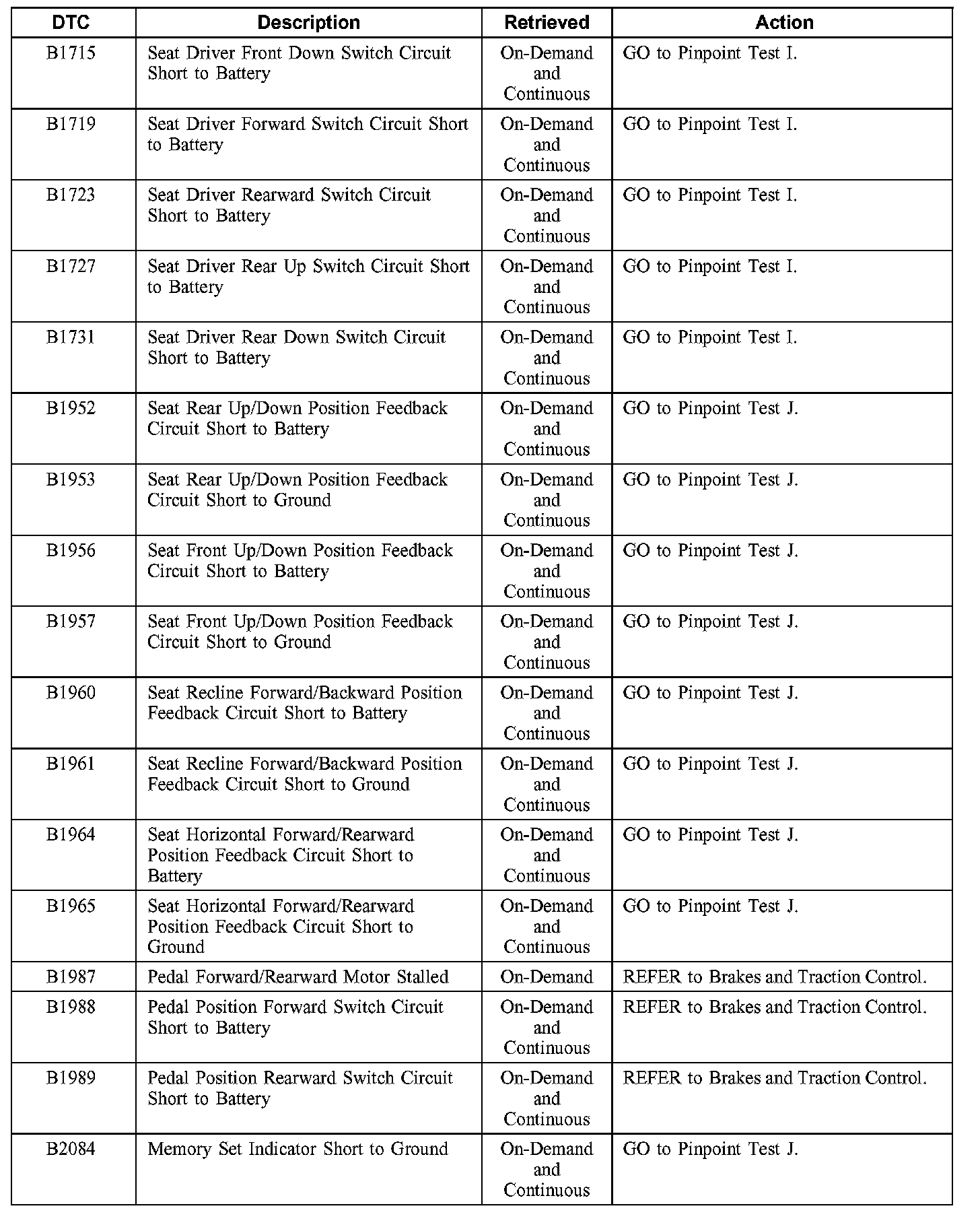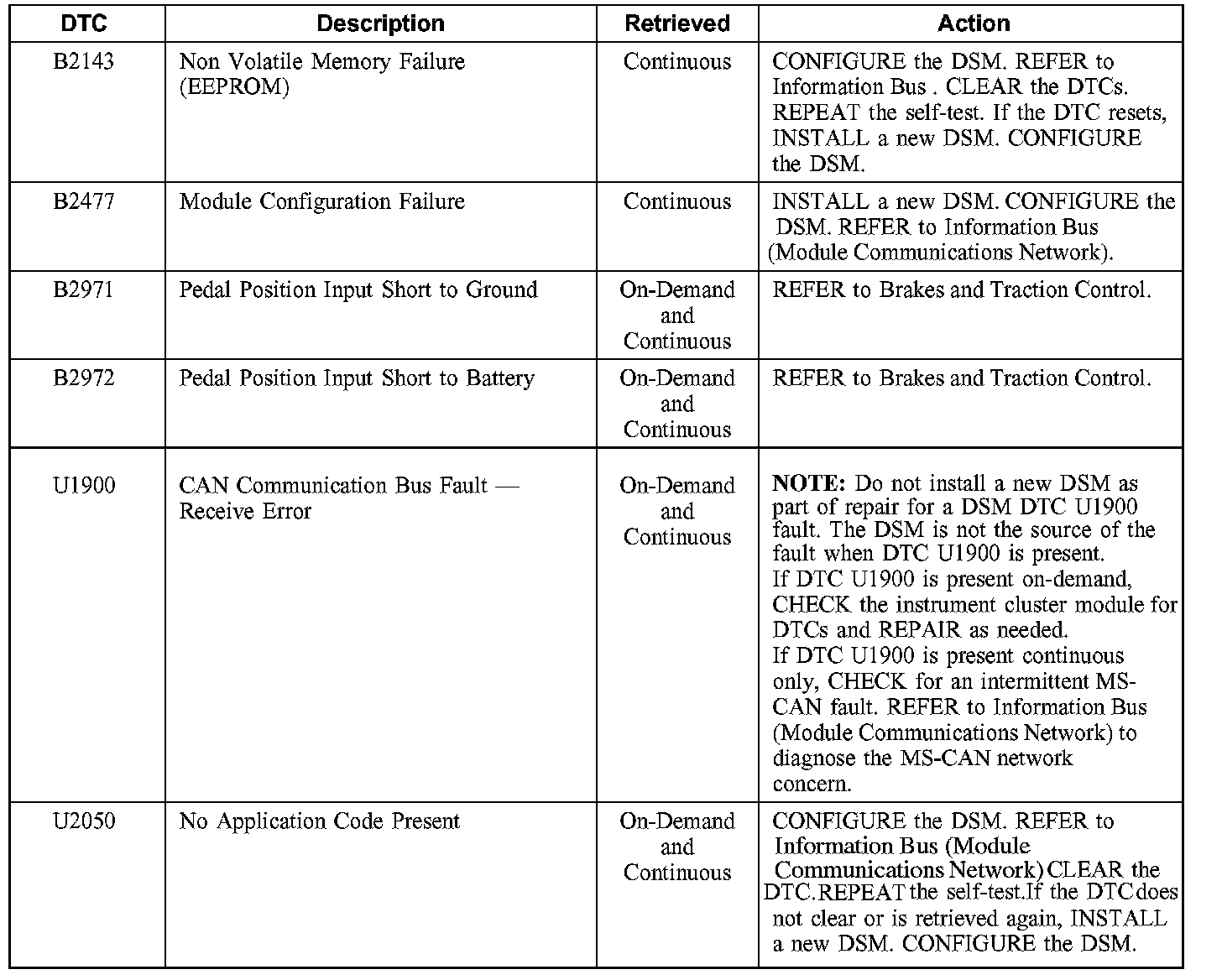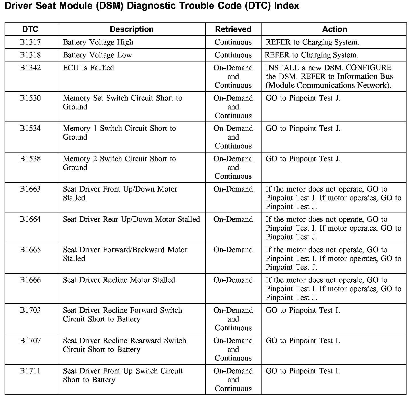 Driver Seat Module (DSM) Diagnostic Trouble Code (DTC) Index