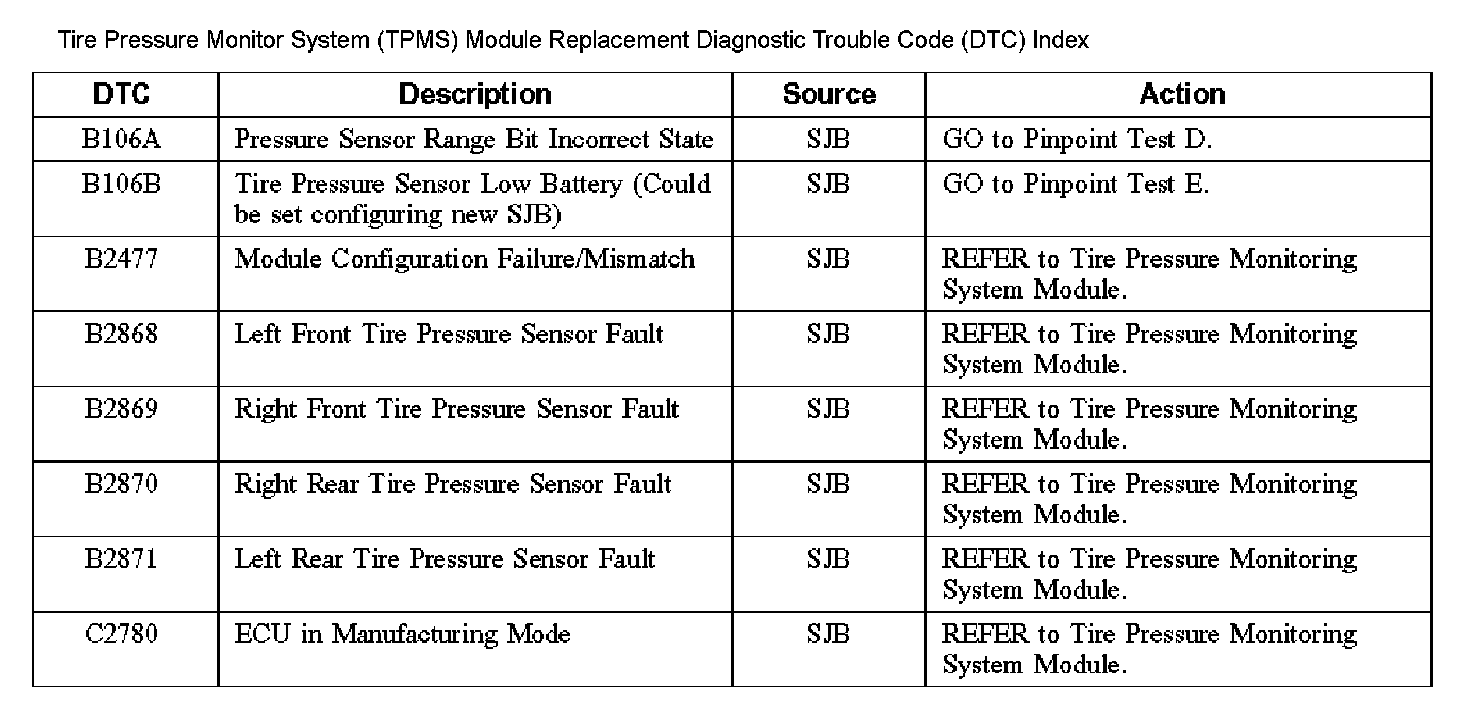 Tire Pressure Monitor System (TPMS) Module Replacement Diagnostic Trouble Code (DTC) Index