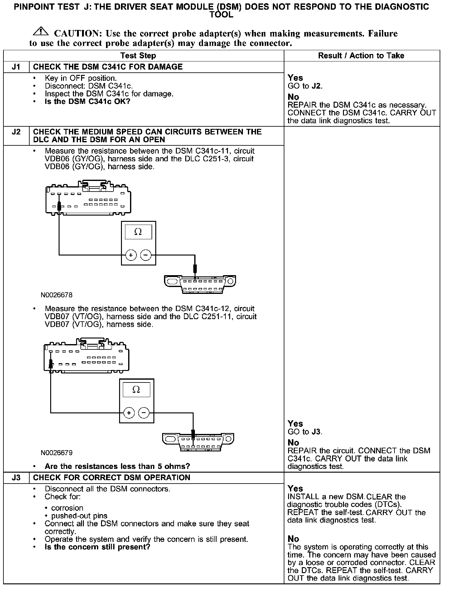 PINPOINT TEST J: THE DRIVER SEAT MODULE (DSM) DOES NOT RESPOND TO THE DIAGNOSTIC TOOLJ1-J3: