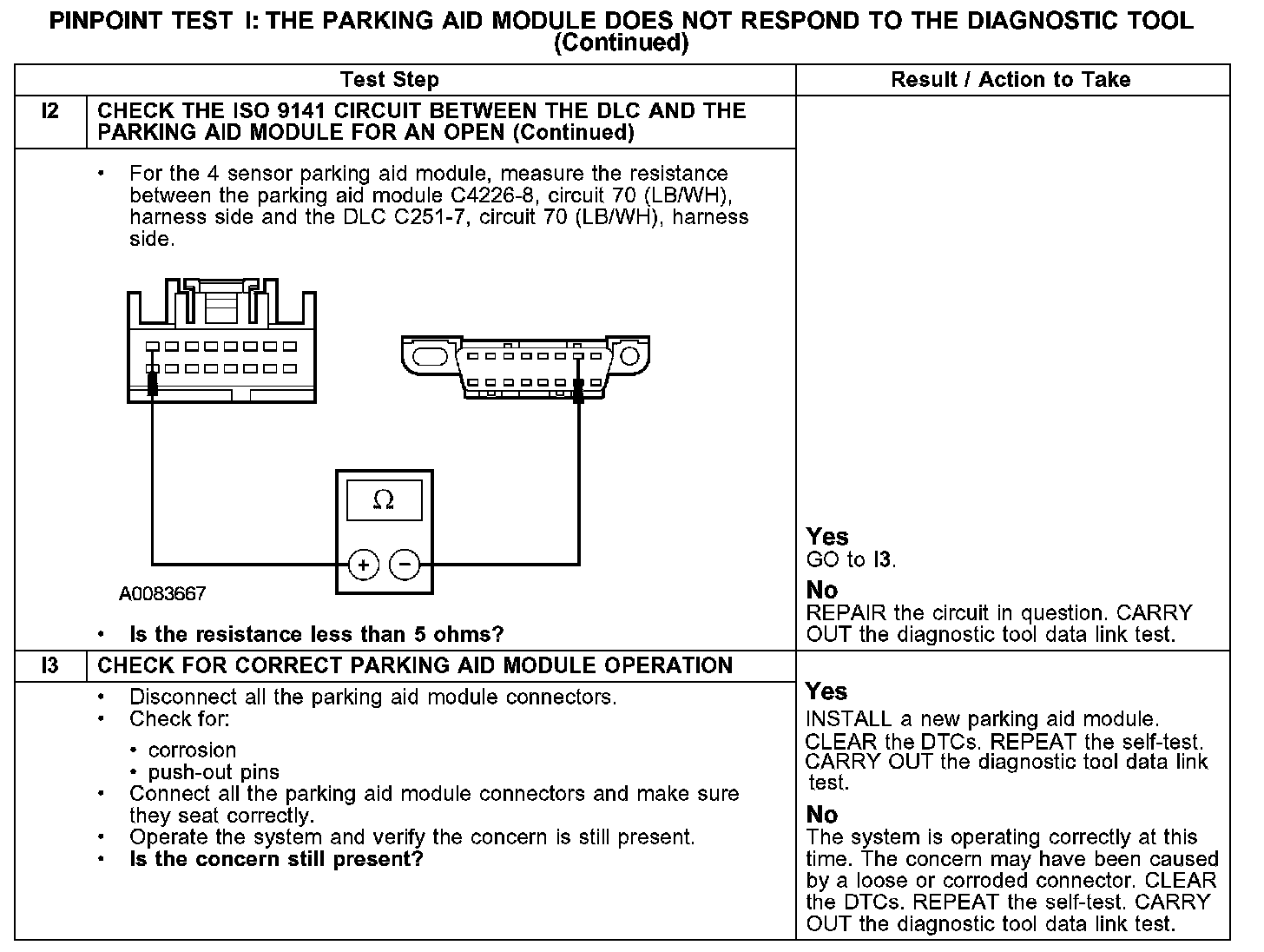 Two versions of this system are available, reverse parking aid with 4 sensors (rear only), and parking aid with 8 sensors (4 additional front sensors). Both types of parking aid module communicate with the diagnostic tool through the international standards organization (ISO) 9141 communication network, circuit 70 (LB/WH). Check circuit 70 (LB/WH) between the parking aid module C4014 (8 sensor) or C4226 (4 sensor), and the data link connector (DLC) C251. The total resistance value must not be more than 5 ohms. If the resistance is more than 5 ohms, there is an open in circuit 70 (LB/WH), damage to the DLC C251, damage to the parking aid module connector, or a problem in the in-line connectors.