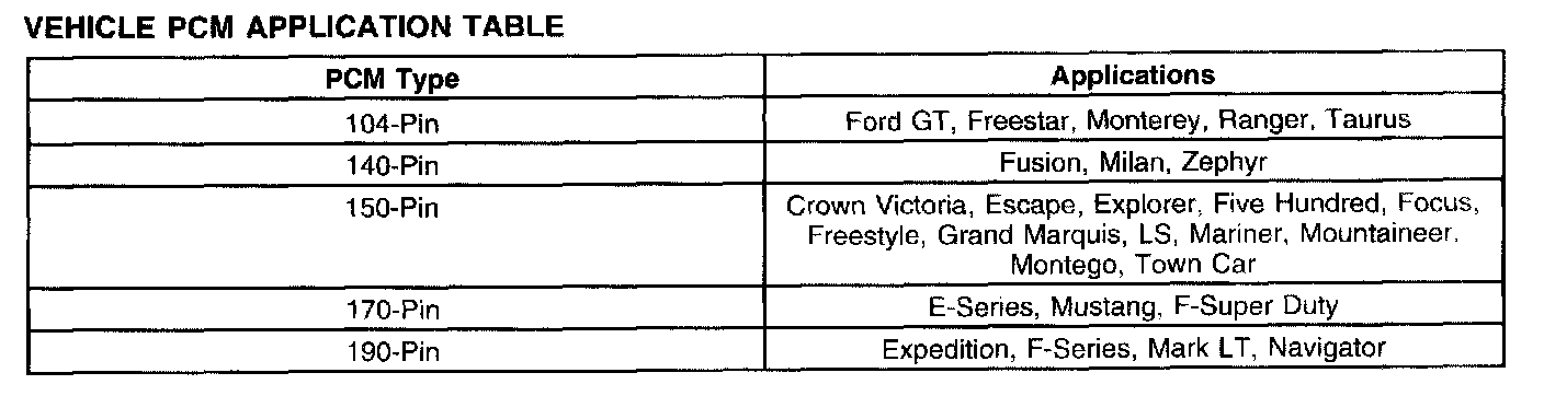 POWERTRAIN CONTROL HARDWAREVehicle PCM Application Table: