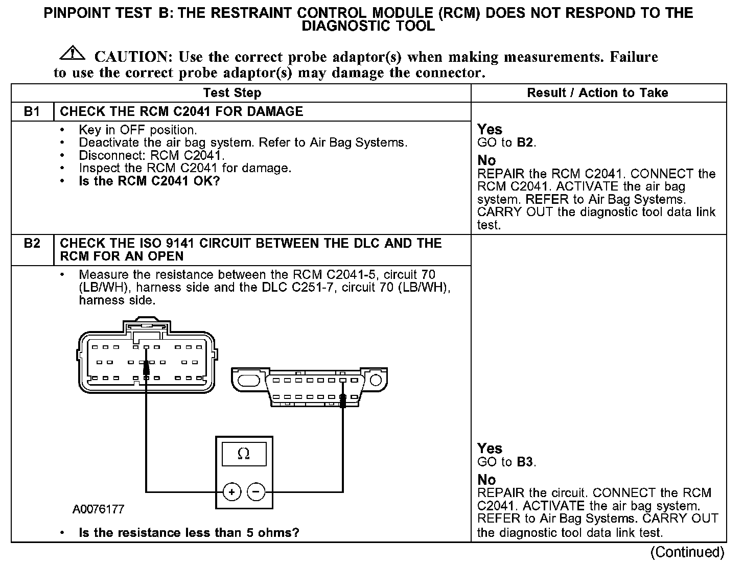 The RCM communicates with the diagnostic tool through the international standards organization (ISO) 9141 communication network circuit 70 (LB/WH). If circuit 70 (LB/WH) becomes open or shorted to ground communications to that module are not possible. Check circuit 70 (LB/WH) between the RCM C2041 and the data link connector (DLC) C251. The total resistance value must not be more than 5 ohms. If the resistance is more than 5 ohms, there is an open in circuit 70 (LB/WH), damage to the DLC C251, or damage to the RCM C2041.