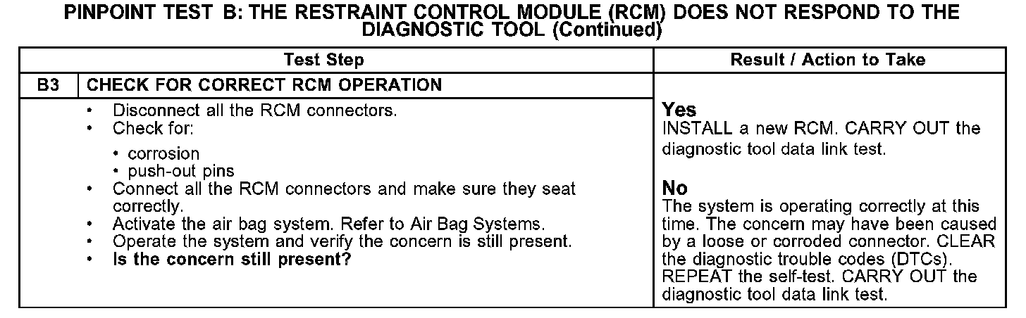 PINPOINT TEST B: THE RESTRAINT CONTROL MODULE (RCM) DOES NOT RESPOND TO THE DIAGNOSTIC TOOLB1-B2: