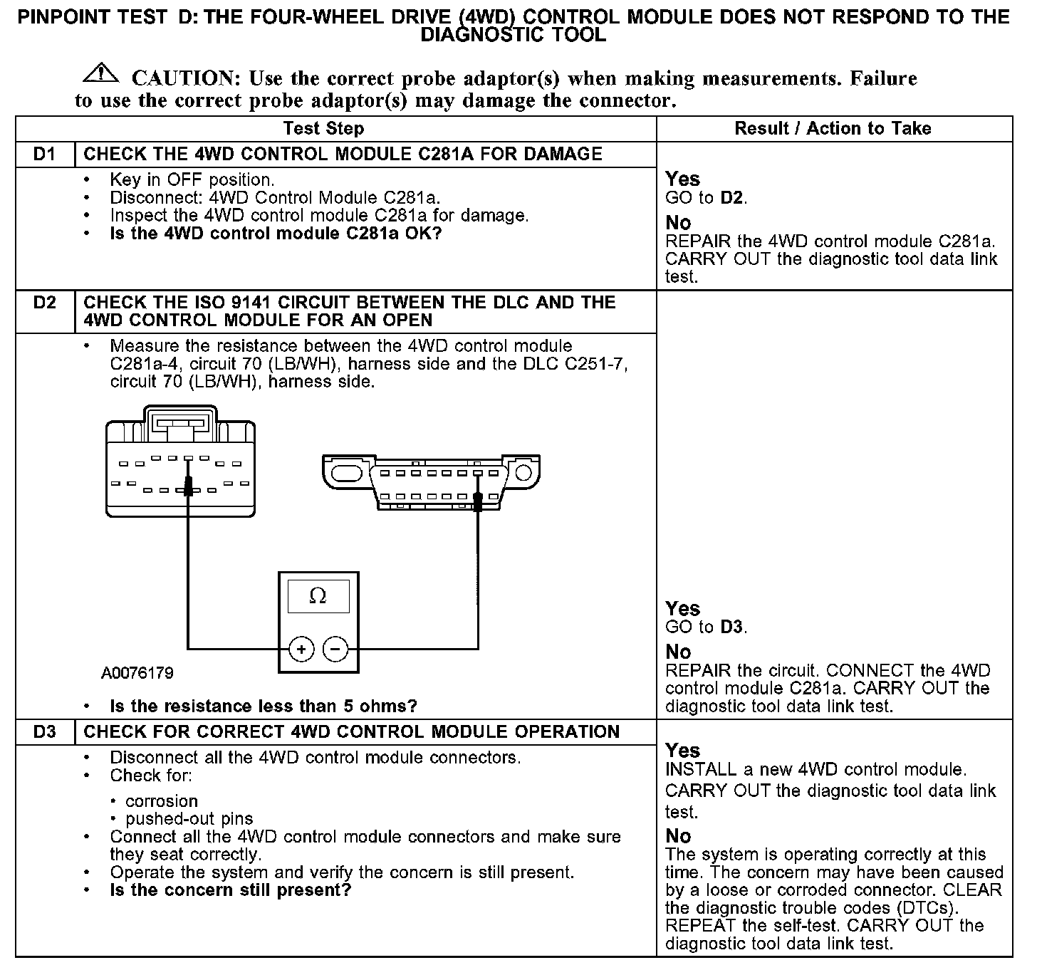The 4WD control module communicates with the diagnostic tool through the international standards organization (ISO) 9141 communication network circuit 70 (LB/WH). If circuit 70 (LB/WH) becomes open or shorted to ground communications to that module are not possible. Check circuit 70 (LB/WH) between the 4WD control module C281a and the data link connector (DLC) C251. The total resistance value must not be more than 5 ohms. If the resistance is more than 5 ohms, there is an open in circuit 70 (LB/WH), damage to the DLC C251, or damage to the 4WD control module C281a.