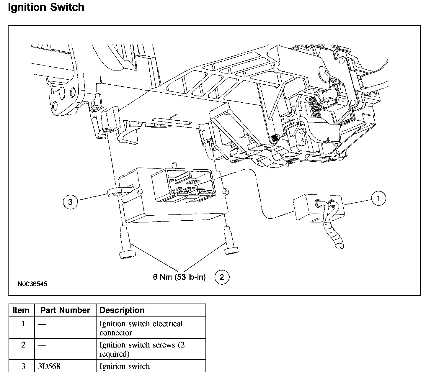 ^ To install, align the ignition switch with the slot and index mark on the steering column and tighten the screws to 6 Nm (53 inch lbs.)