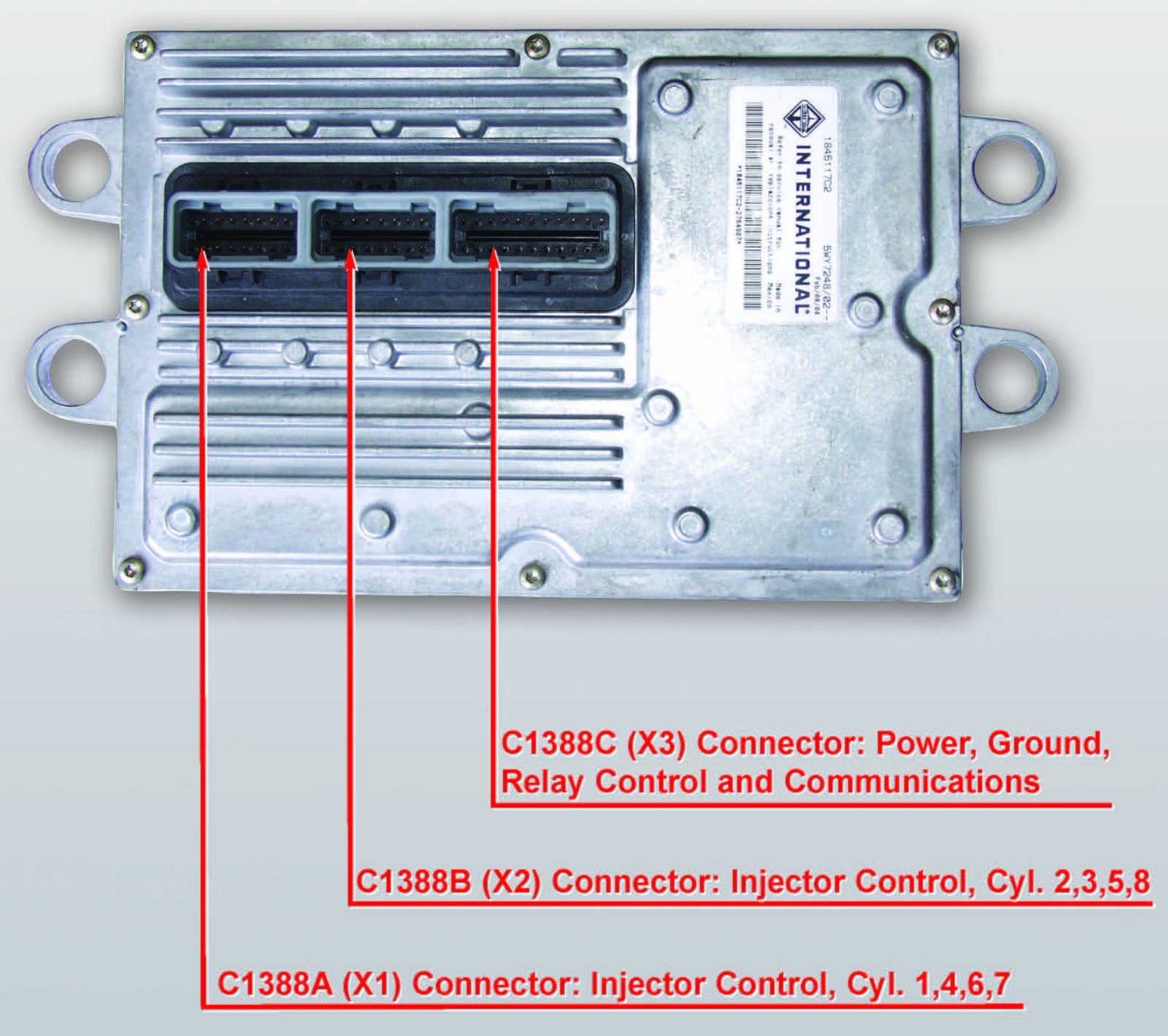 On 2004.25+ (1845117C2 FICMs) the low side driver is actually shared among 4 injectors This means an injector short to ground on the low side could produce four different cylinder error codes On 2003.25 (1837127C4 FICMs) there are individual low side drivers for each injector. This means a low side failure would result in a single injector error code. Note: International FICM part numbers are located on a label on the connector side of the module.