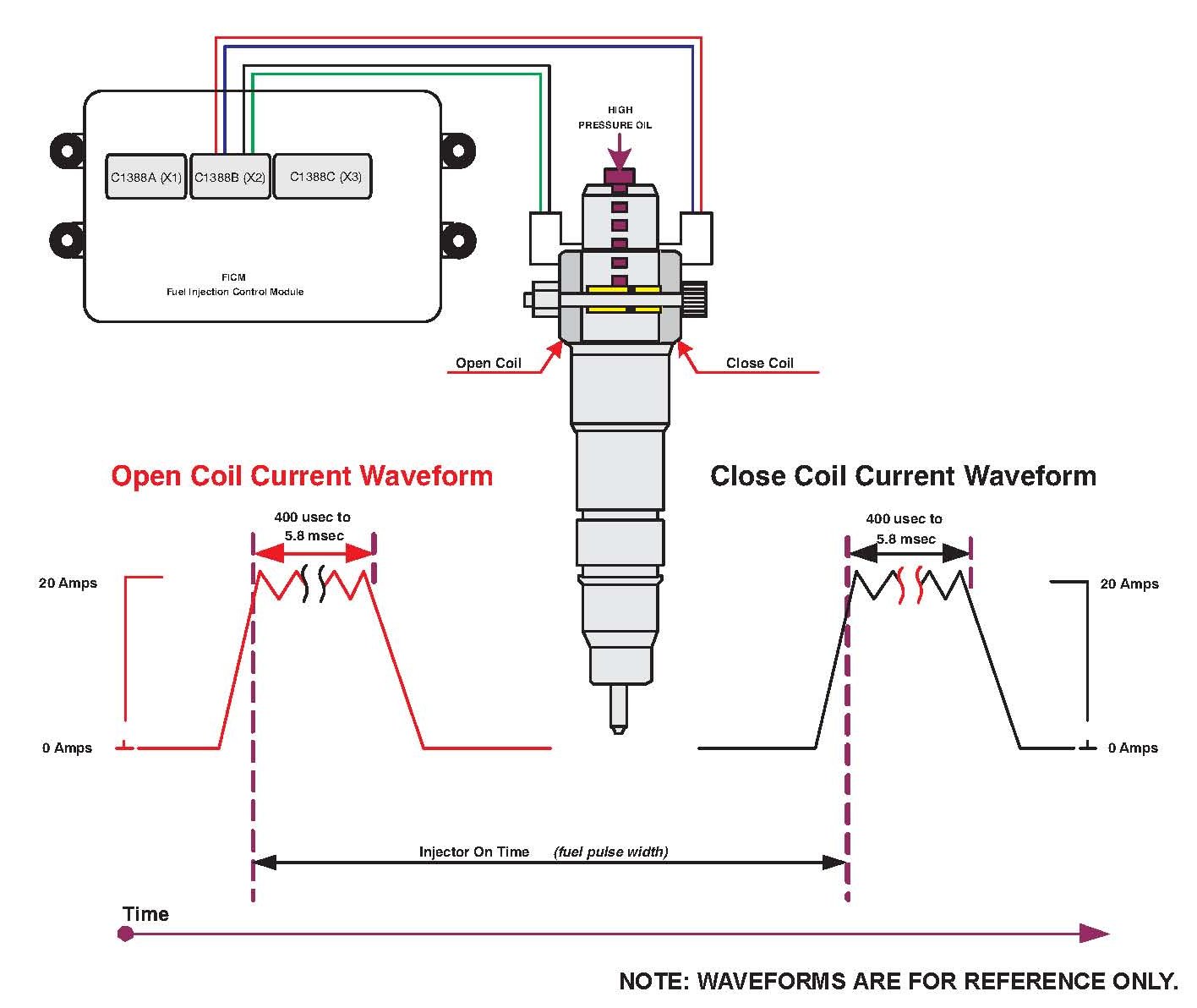 Once the desired fuel has a been delivered, as calculated by the PCM/FICM, the close coil is driven (via a 20A pulse) to close the injector. This stops the distribution of high pressure oil to the top of the intensifier piston thus stopping the delivery of fuel.