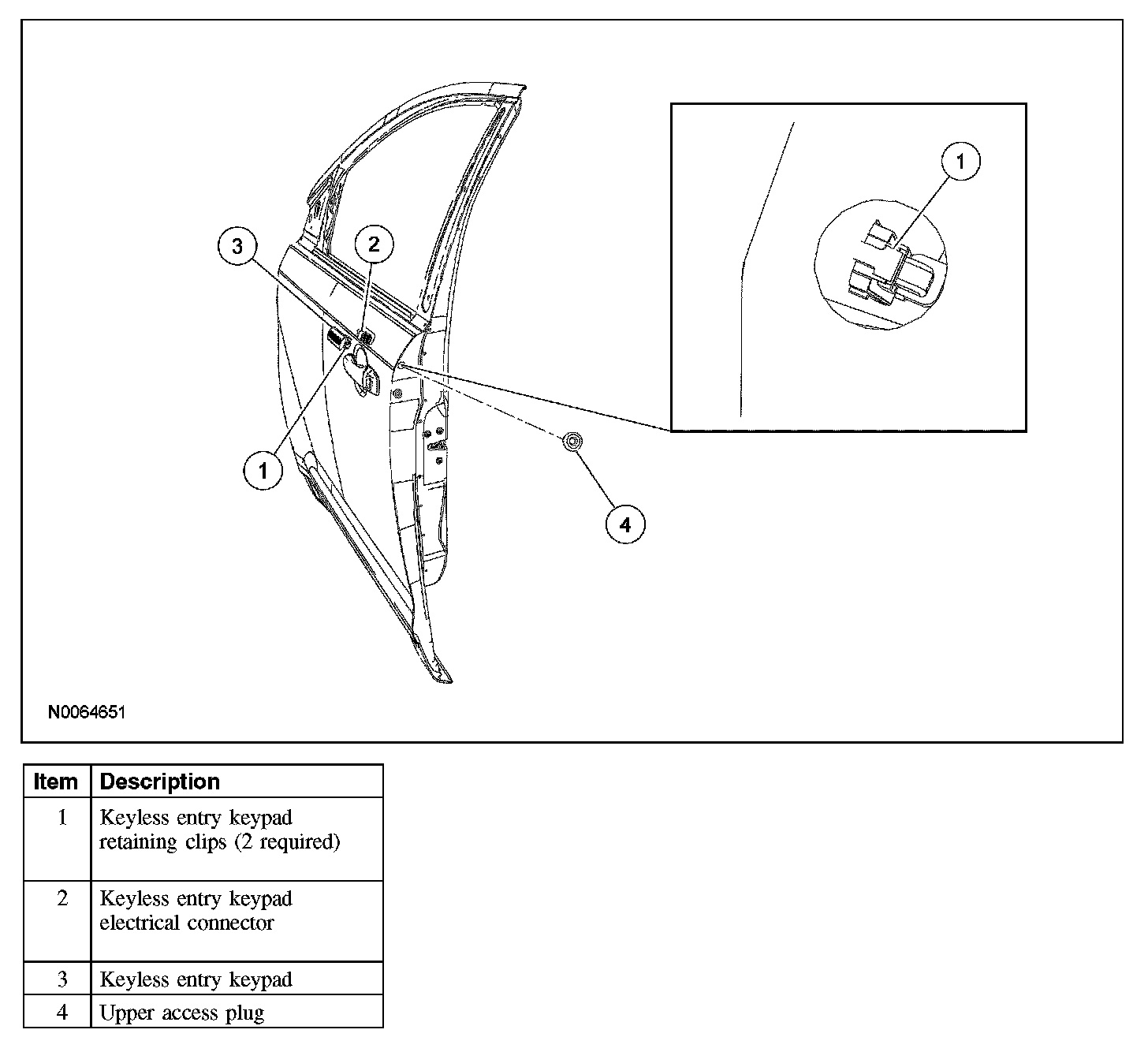 2. Using a long, flat blade screwdriver, or suitable tool through the upper access hole, release the rear keyless entry keypad retaining clip and position the keyless entry keypad aside.