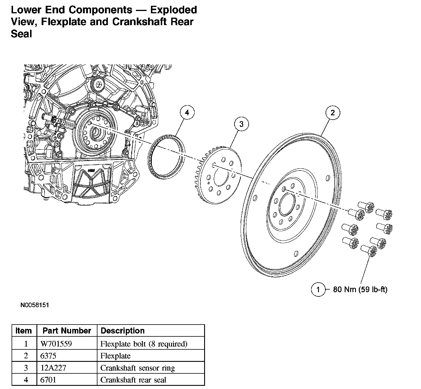Lower End Components - Exploded View, Flexplate and Crankshaft Rear Seal