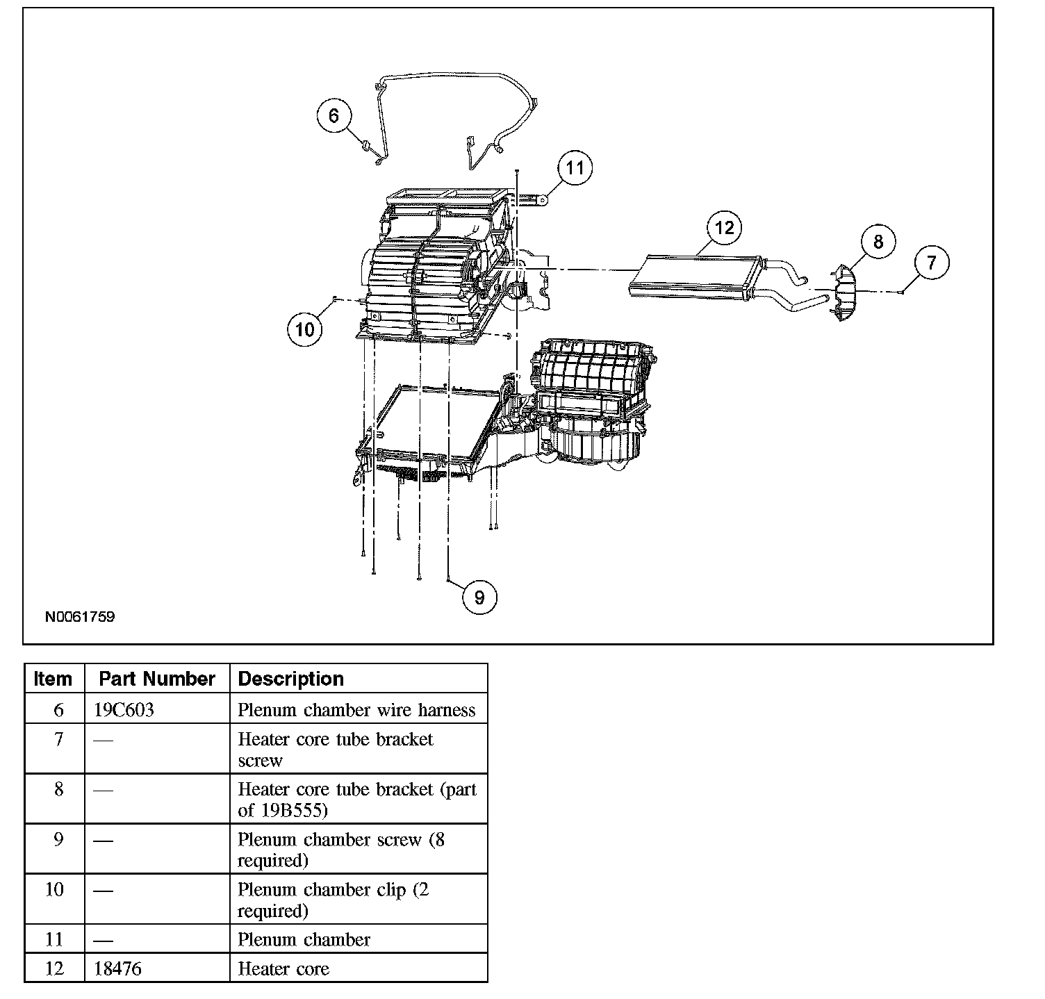 11. CAUTION: Do not handle the heater core by the inlet and/or outlet tube to remove. Handling the heater core by the tubes may damage the joints and lead to failure of the heater core.