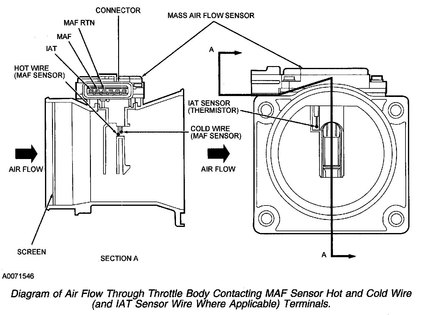 Diagram Of Air Flow Through Throttle Body Contacting MAF Sensor Hot And Cold Wire (and IAT Sensor Wire Where Applicable) Terminals: