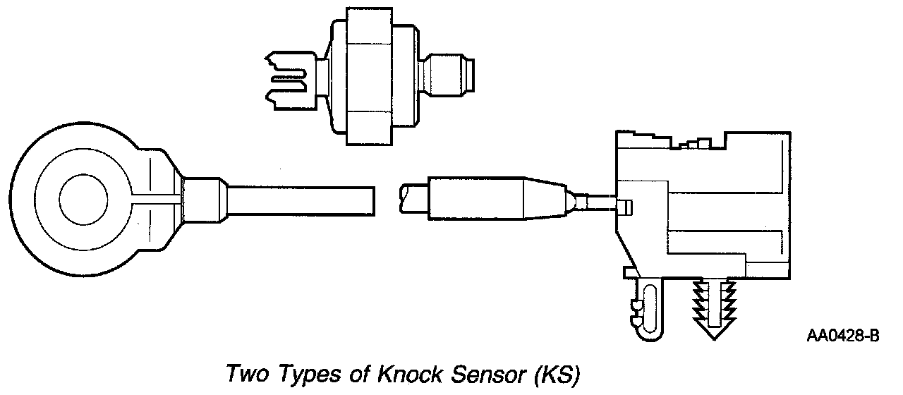 The KS is a tuned accelerometer on the engine which converts engine vibration to an electrical signal. The PCM uses this signal to determine the presence of engine knock and to retard spark timing.