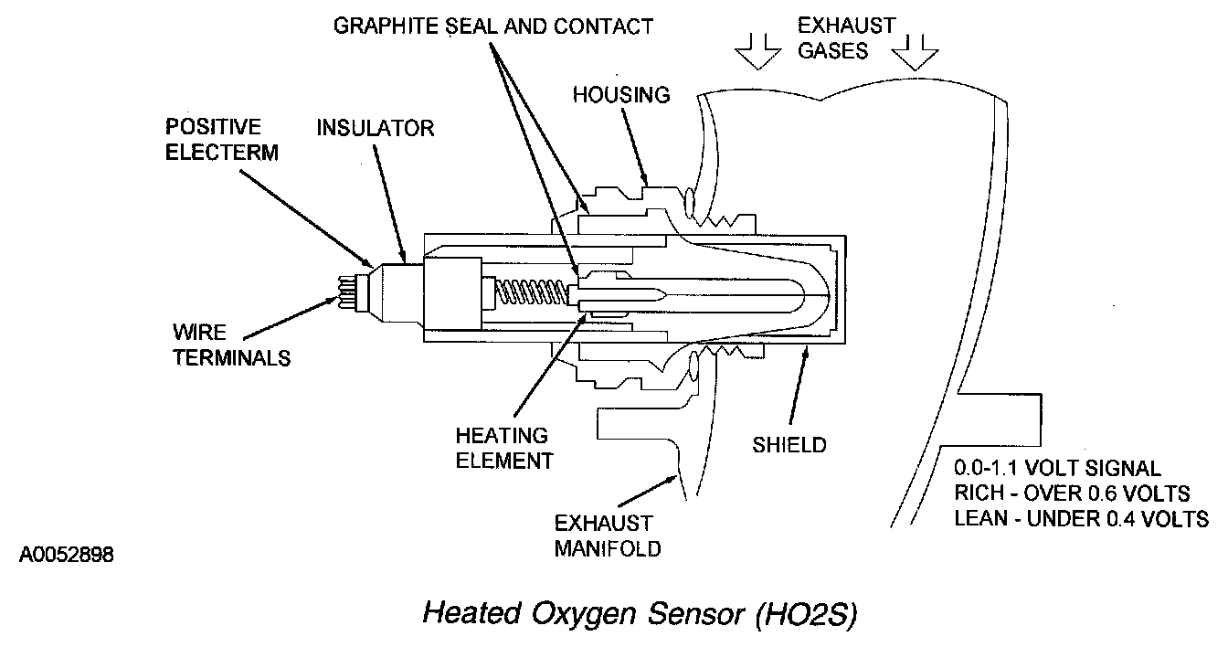 The HO2S detects the presence of oxygen in the exhaust and produces a variable voltage according to the amount of oxygen detected. A high concentration of oxygen (lean air/fuel ratio) in the exhaust produces a voltage signal less than 0.4 volt. A low concentration of oxygen (rich air/fuel ratio) produces a voltage signal greater than 0.6 volt. The HO2S provides feedback to the PCM indicating air/fuel ratio in order to achieve a near stoichiometric air/fuel ratio of 14.7:1 during closed loop engine operation. The HO2S generates a voltage between 0.0 and 1.1 volts.