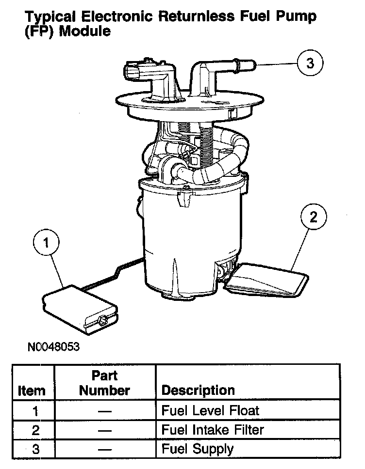 The FP module is a device that contains the fuel pump and sender assembly. The fuel pump is located inside the FP module reservoir and supplies fuel through the FP module manifold to the engine and FP module jet pump. The jet pump continuously refills the reservoir with fuel, and a check valve located in the manifold outlet maintains system pressure when the fuel pump is not energized. A flapper valve located in the bottom of the reservoir allows fuel to enter the reservoir and prime the fuel pump during the initial fill.