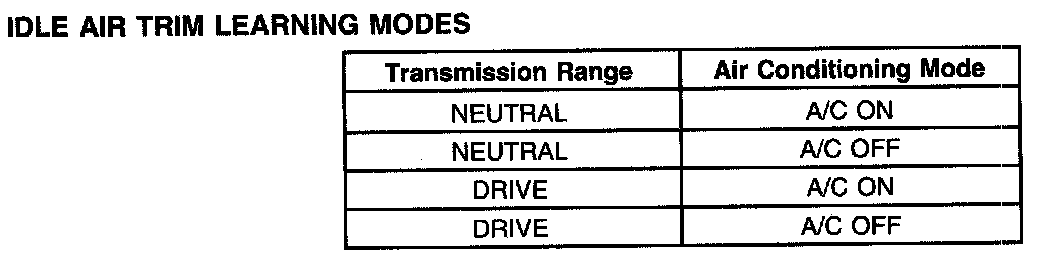 Once the KAM has been reset, the engine must idle for 15 minutes (actual time varies between strategies) to learn new idle air trim values. Idle quality improves as the strategy adapts. Adaptation occurs in 4 separate modes as shown in the table.
