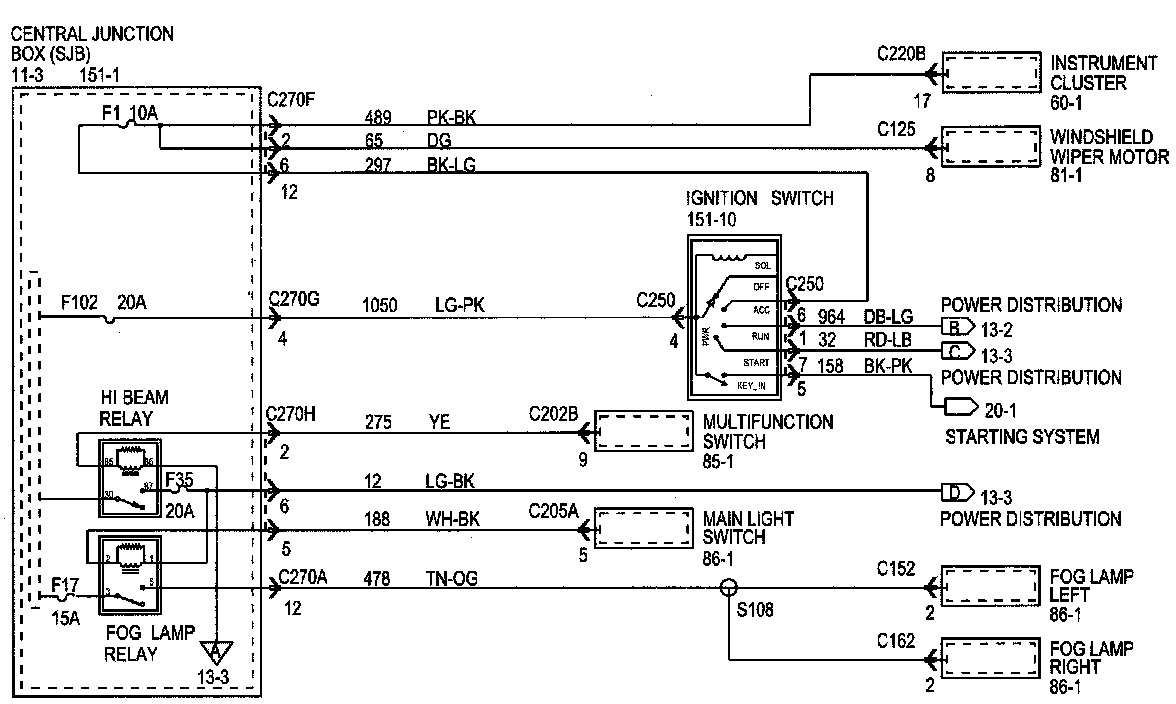 Each set normally starts with the component that powers the circuit, such as a fuse or the ignition switch. Current flow is shown from the power source at the top of the diagram to ground at the bottom of the diagram. A full representation of the power supply of a fuse or the power distribution from a fuse to various components is given in Power and Ground Distribution Diagrams. Full representation of the ground connections are shown in Power and Distribution Diagrams.