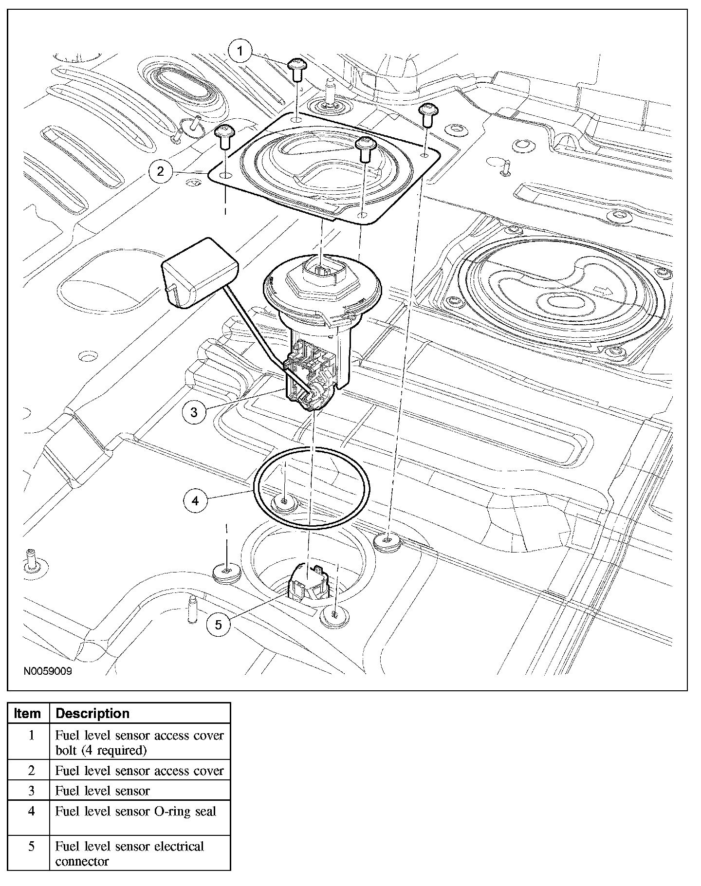12. CAUTION: Inspect the mating surfaces of the fuel level sensor flange and the fuel tank O-ring seal contact surfaces. Do not polish or adjust the O-ring seal contact area of the fuel tank flange or the fuel tank. Install a new fuel level sensor or fuel tank if the O-ring seal contact area is bent, scratched or corroded.