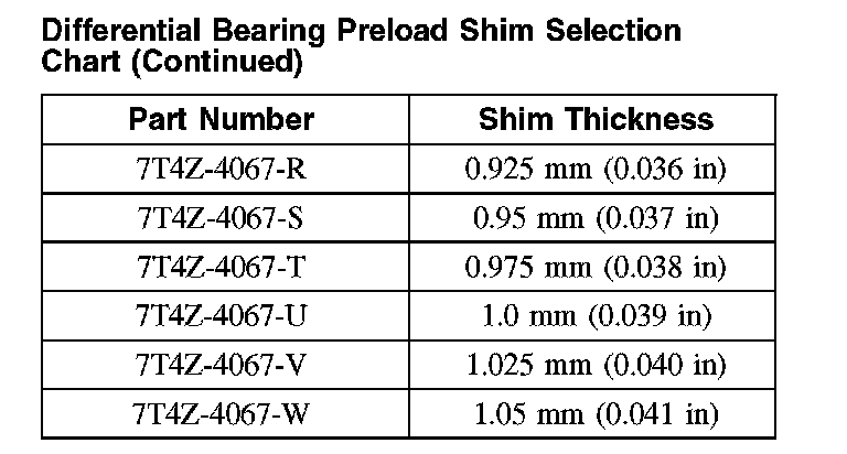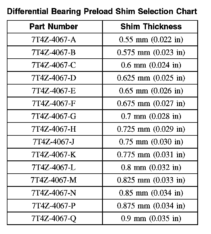 Differential Bearing Preload Shim Selection Chart