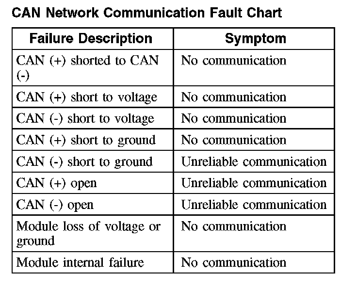 The fault chart describes the specific CAN network failures and their resulting symptom.