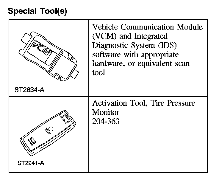 NOTE: If the vehicle has been stationary for more than 30 minutes, the sensors will go into a "sleep mode" to conserve battery power. It will be necessary to wake them up so they will transmit the latest tire pressure information to the smart junction box (SJB).