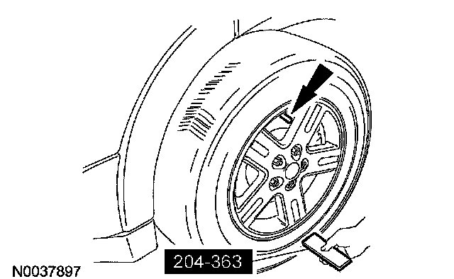 Place the activation tool on the LF tire sidewall opposite (180 degrees) from the valve stem. Press and release the test button on the special tool. The horn will sound briefly to indicate that the tire pressure sensor has been recognized by the smart junction box (SJB).