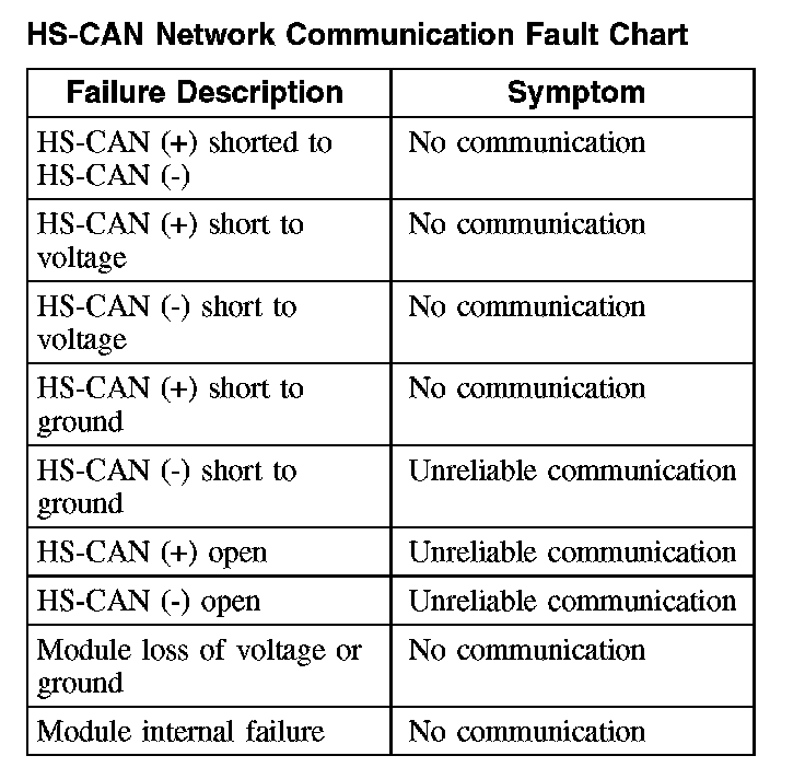 The fault chart describes the specific HS-CAN network failures and their resulting symptom: