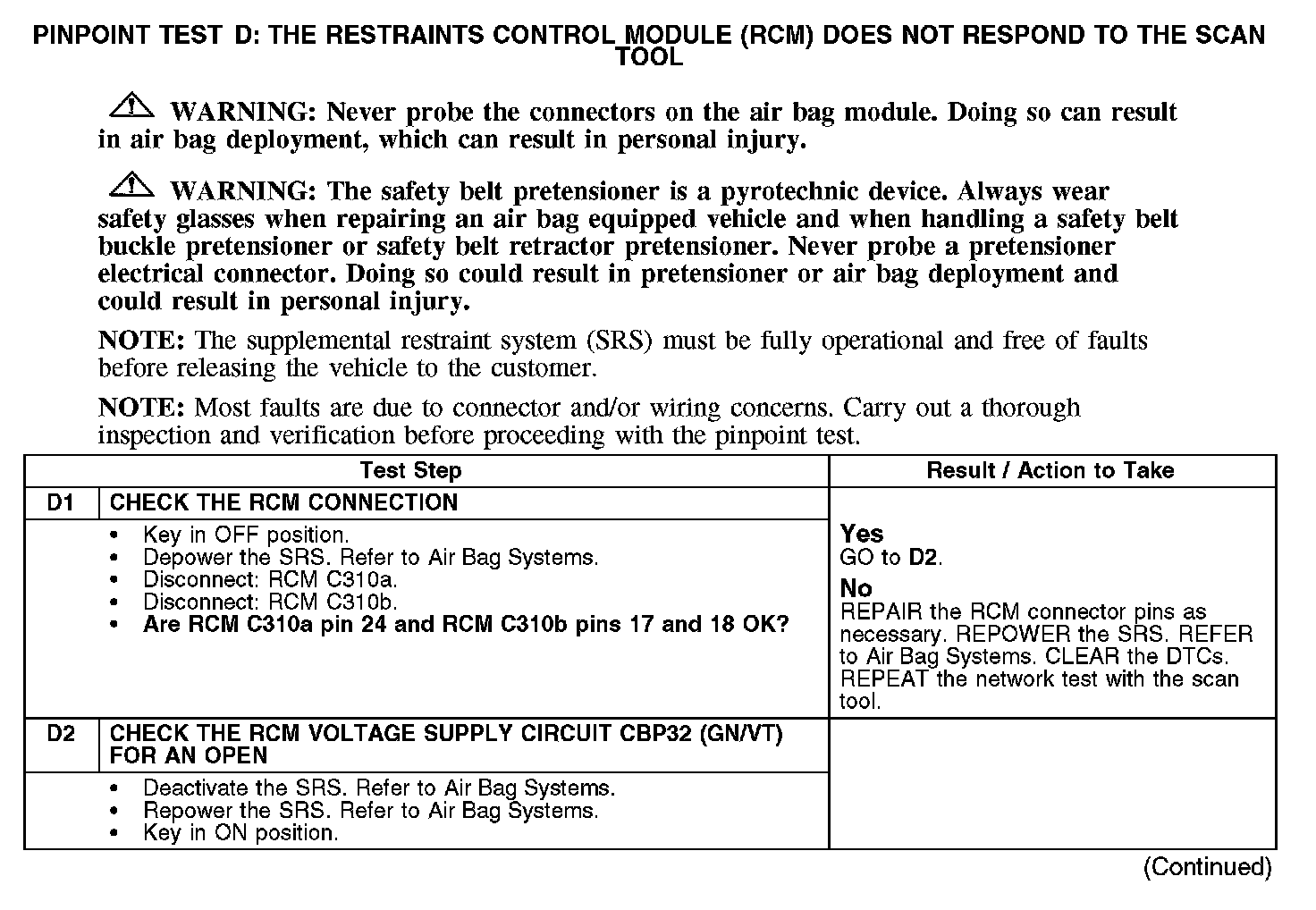 PINPOINT TEST D: THE RESTRAINTS CONTROL MODULE (RCM) DOES NOT RESPOND TO THE SCAN TOOLD1-D2: