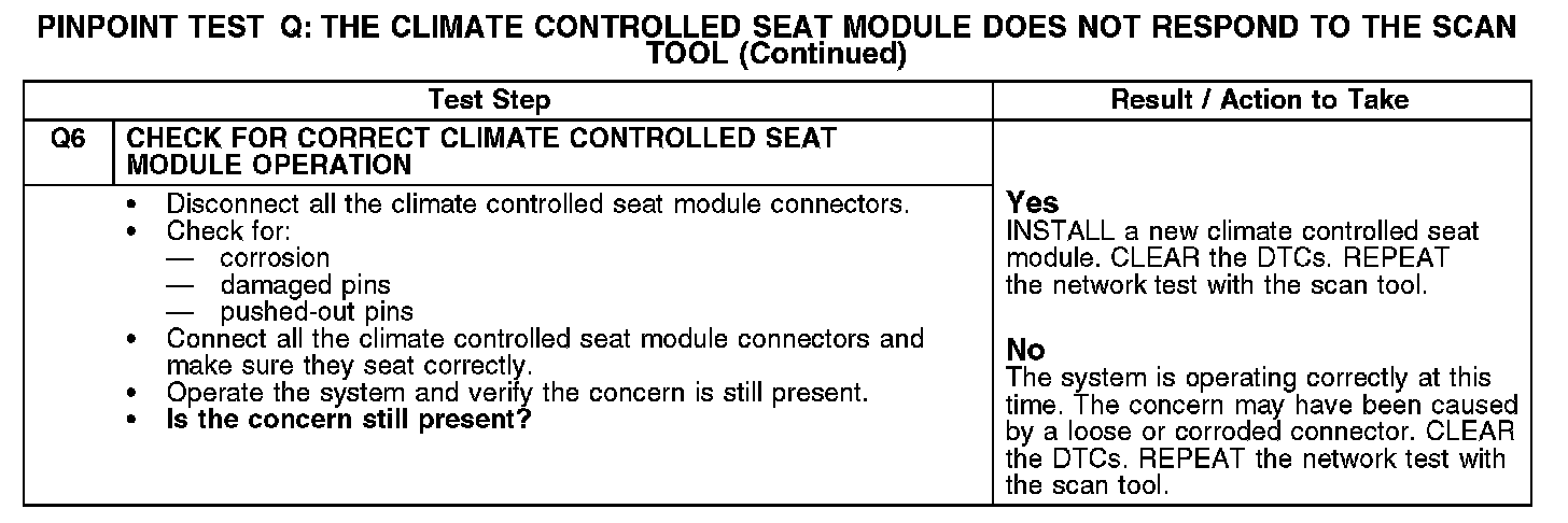 PINPOINT TEST Q: THE CLIMATE CONTROLLED SEAT MODULE DOES NOT RESPOND TO THE SCAN TOOLQ1: