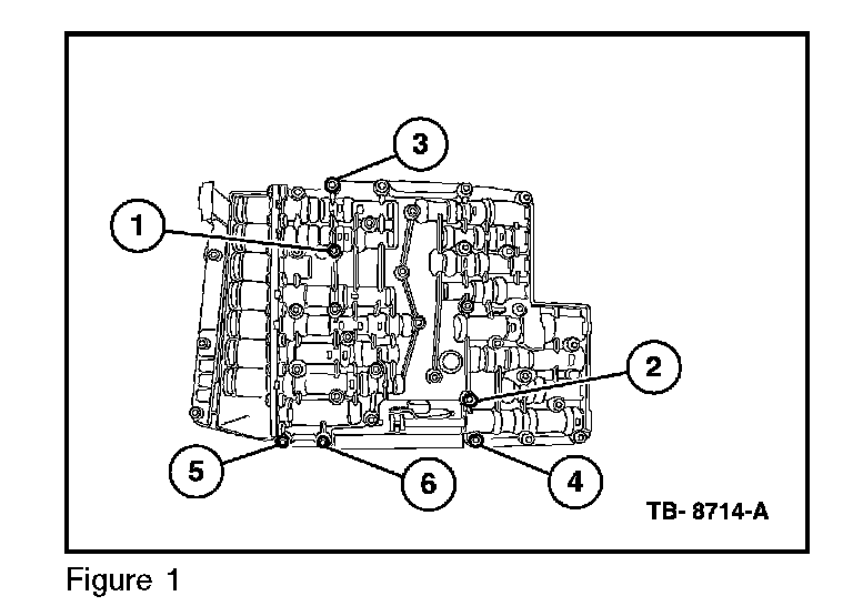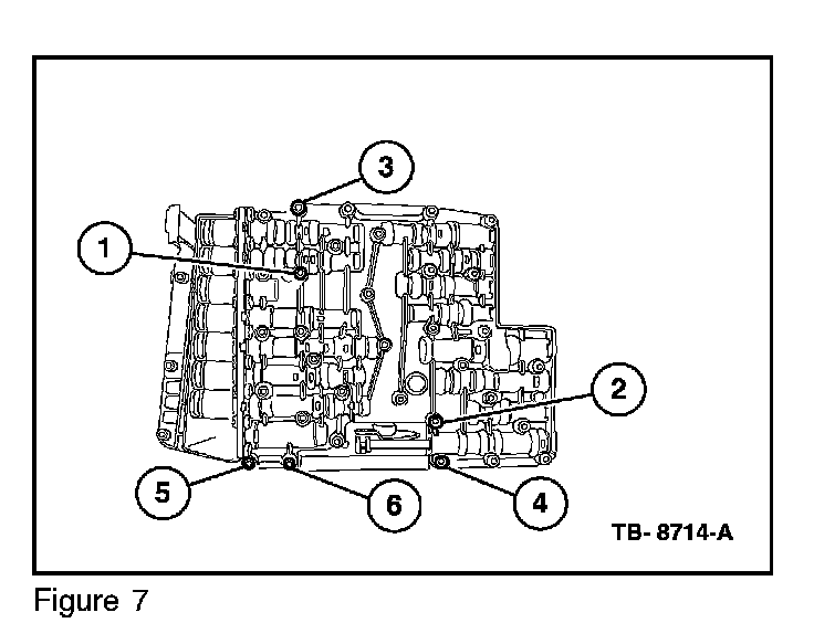 7. Reinstall the TCU on to the main control. Install the six (6) long bolts into the TCM unit. Tighten to 53 lb-in (6 N.m). (Figure 7) Reinstall/verify the cooler bypass valve (spring end into the case first, "point" down), reinstall pump seal adaptor, and four (4) center support seals following WSM, Section 307-01.