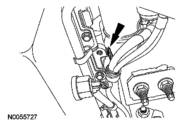 8. Remove the transmission cooler tube support bracket nut and detach the battery cable bracket and transmission cooler line bracket from the front cover stud.