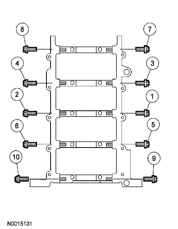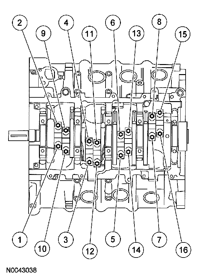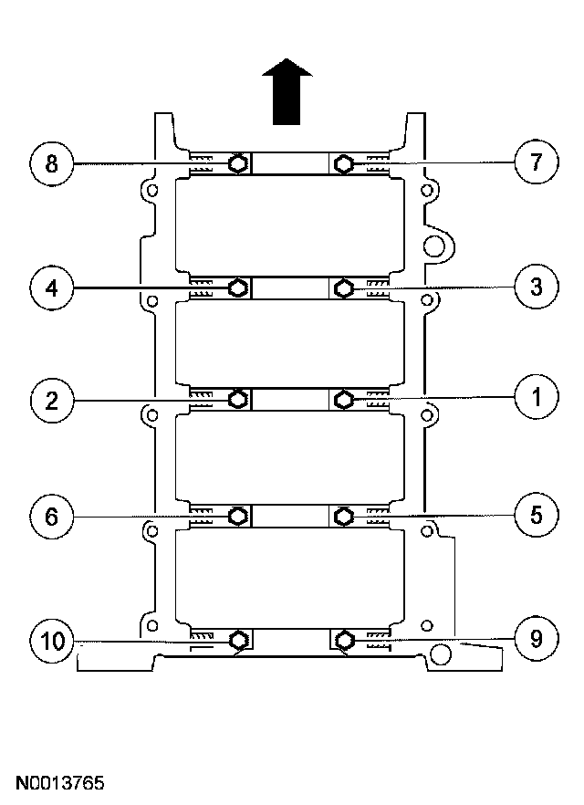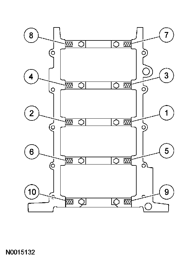 Tighten the vertical main bearing cap fasteners in the sequence shown, in 2 stages.