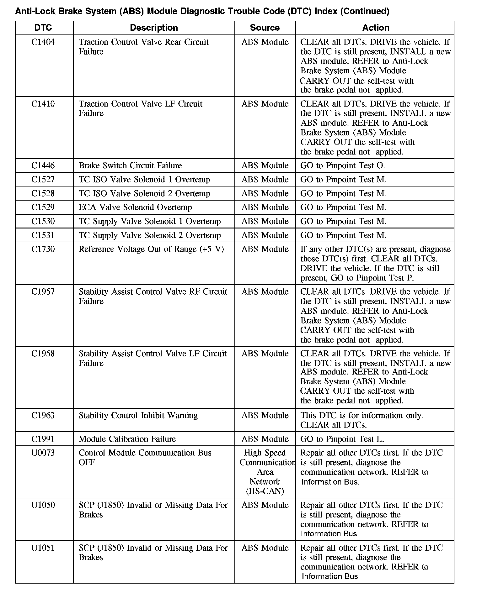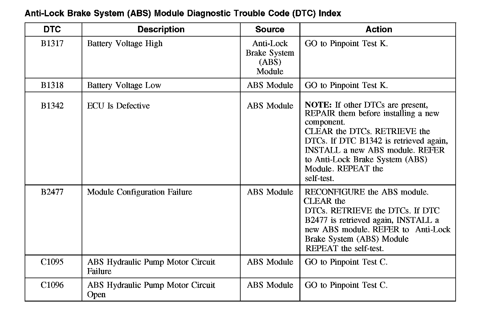 Anti-Lock Brake System (ABS) Module Diagnostic Trouble Code (DTC) Index