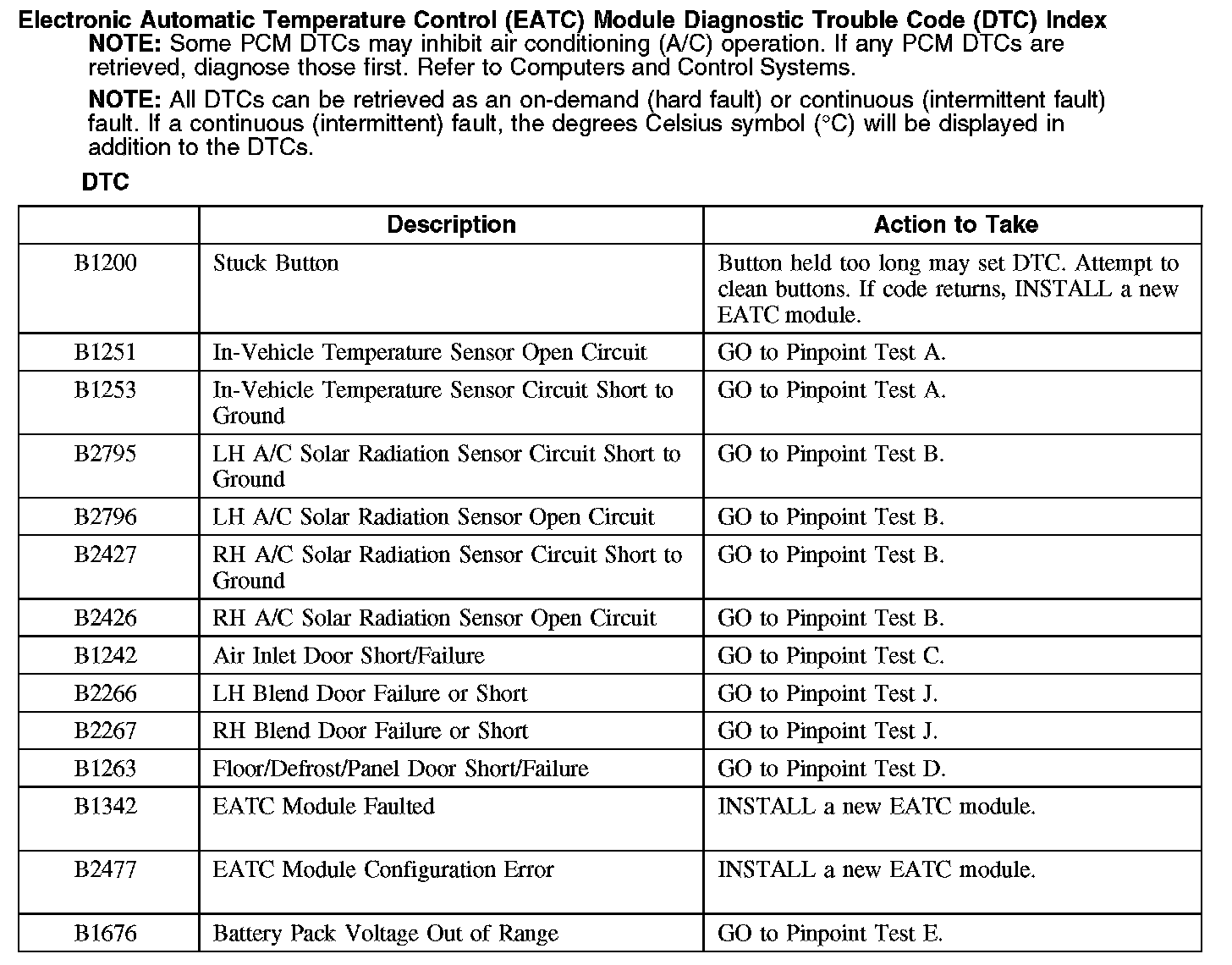Electronic Automatic Temperature Control (EATC) Module Diagnostic Trouble Code (DTC) Index