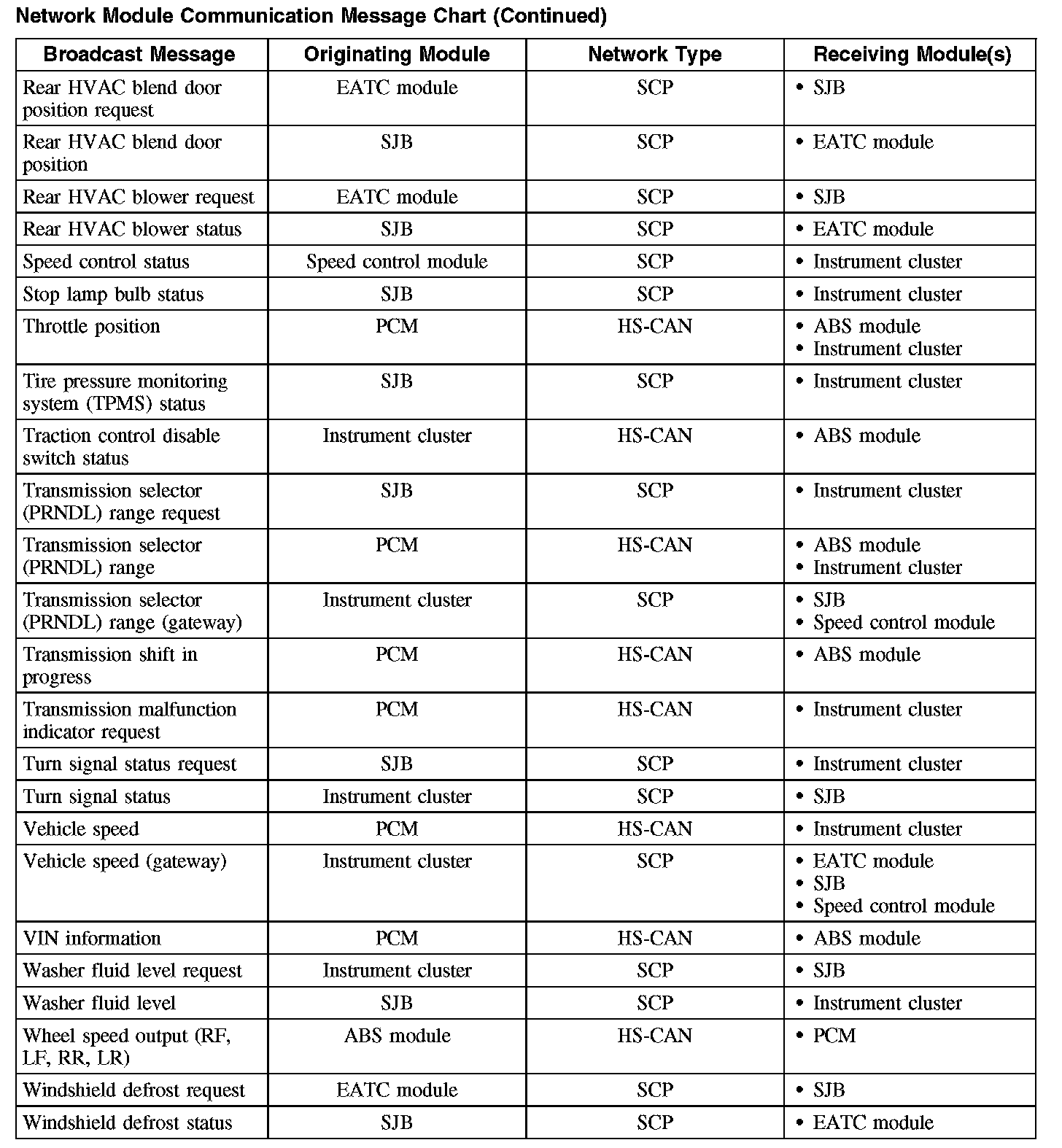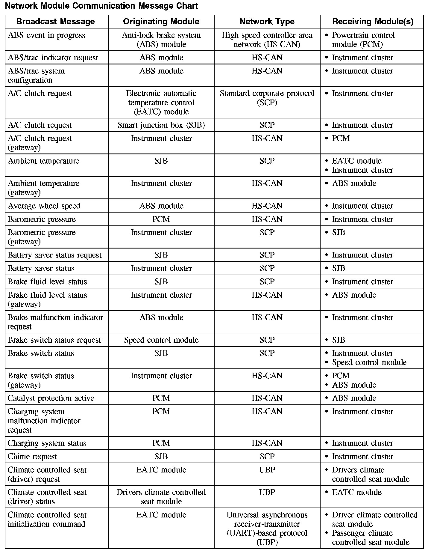 The chart describes all network messages broadcast on HS-CAN, SCP and UBP by each module, and the module(s) that receive the message.