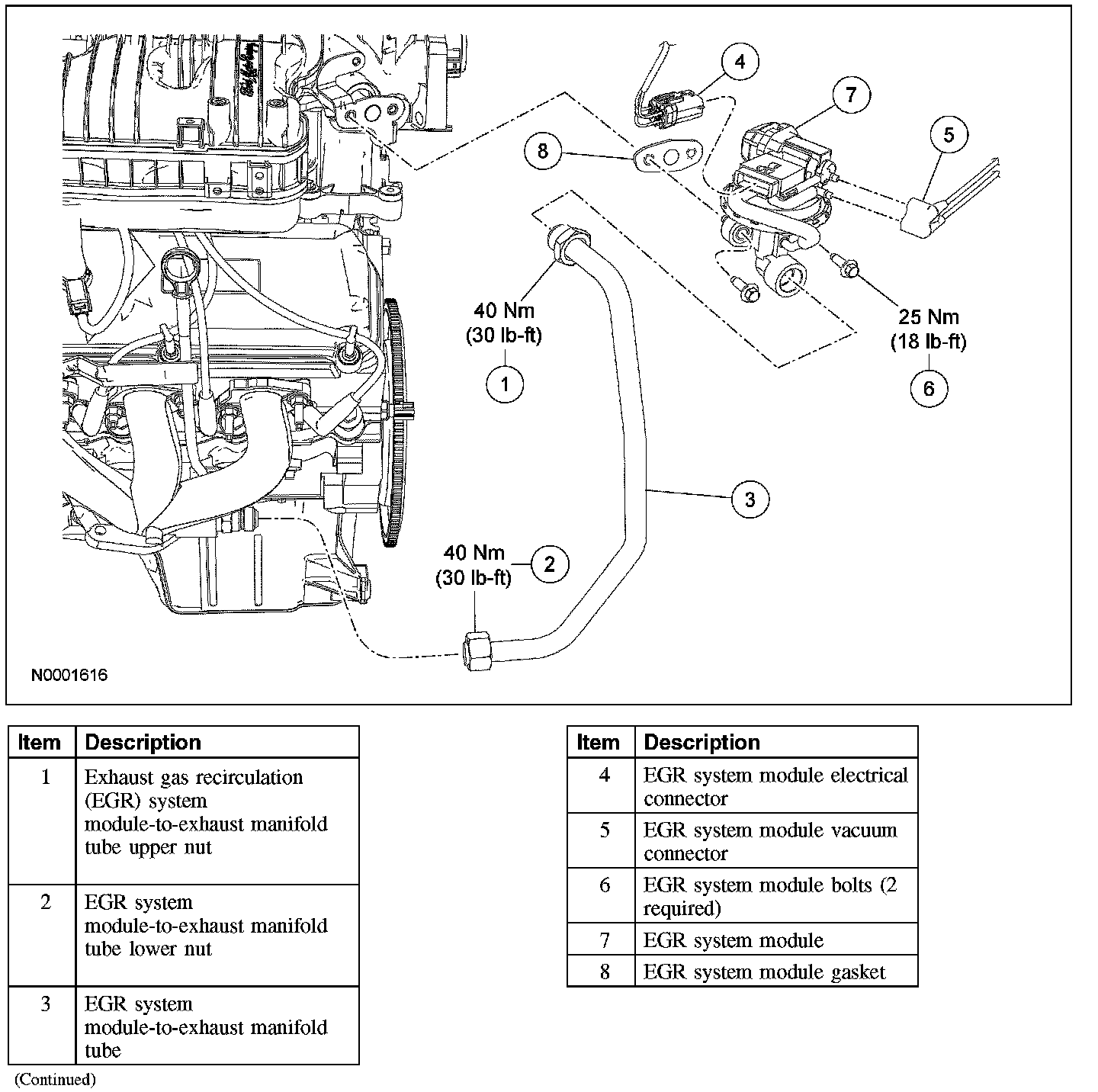 4. Disconnect the EGR system module-to-exhaust manifold tube lower nut and remove the EGR system module-to-exhaust manifold tube.