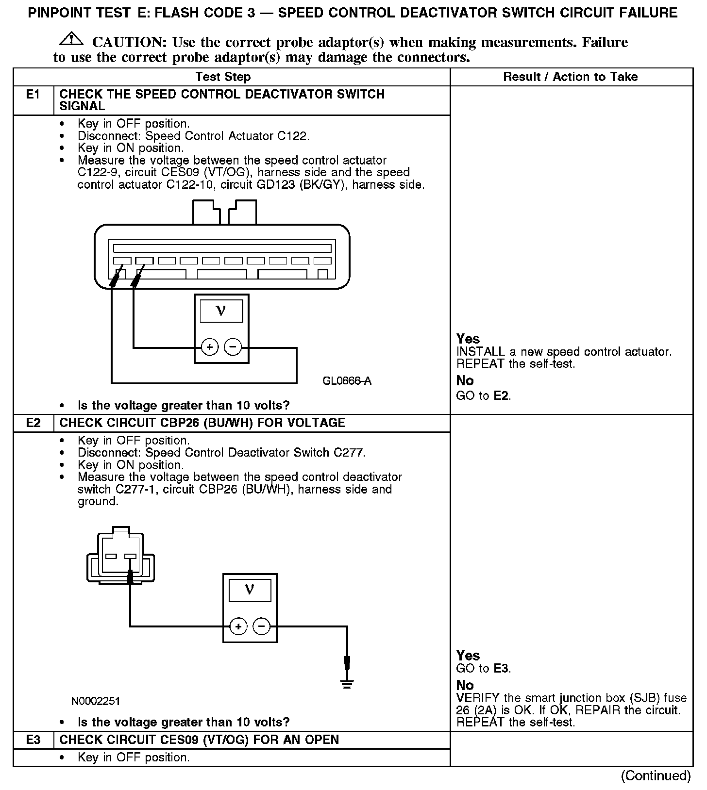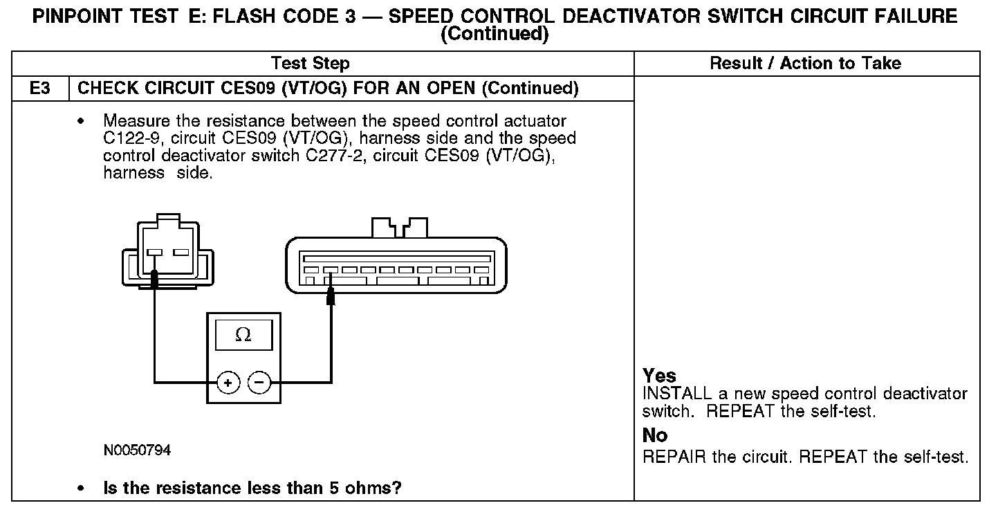PINPOINT TEST E: FLASH CODE 3 - SPEED CONTROL DEACTIVATOR SWITCH CIRCUIT FAILUREE1-E3: