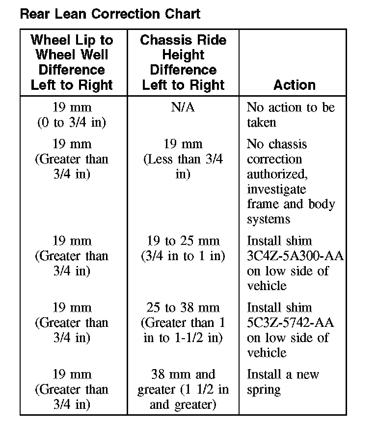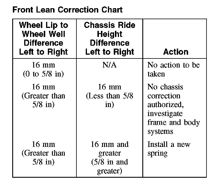 9. Using the recorded front wheel well difference numbers, the recorded front chassis ride height difference numbers and the following repair action chart, determine what repair action is needed to correct the vehicle lean condition.