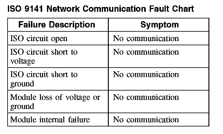 The following fault chart describes the specific ISO 9141 network failures and their resulting symptom: