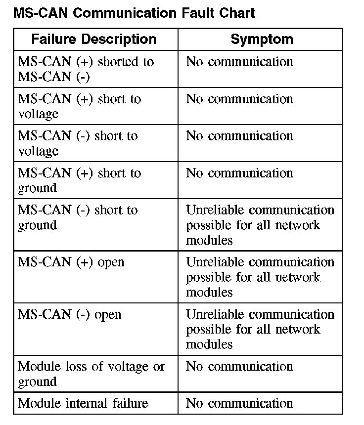 The following fault chart describes the specific MS-CAN failures and their resulting symptom:
