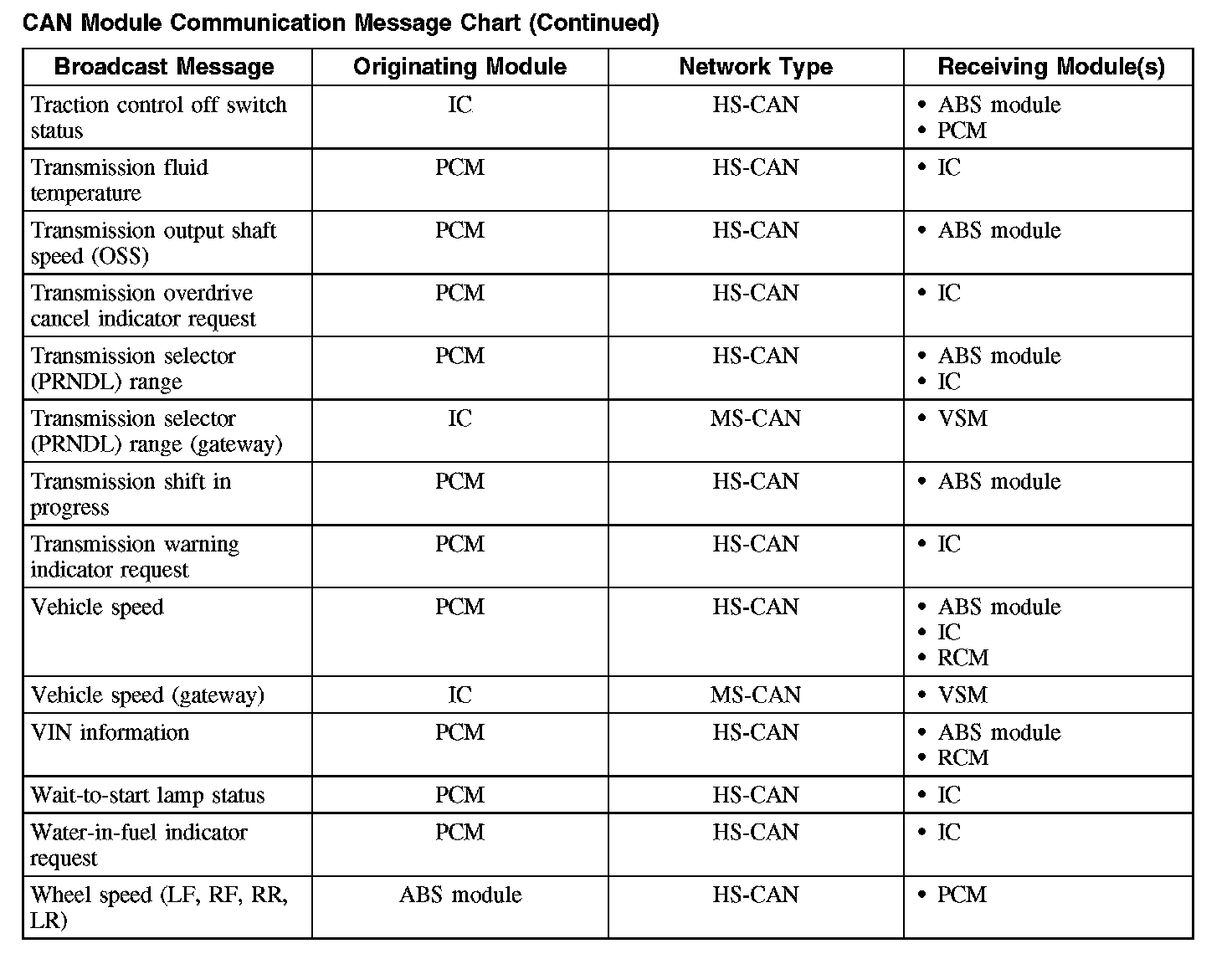 The following chart describes the specific CAN messages broadcast by each module, and the module(s) that receive the message: