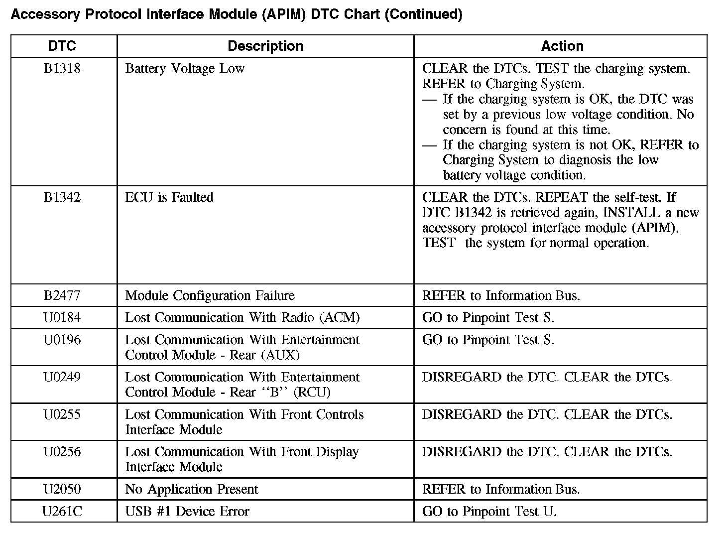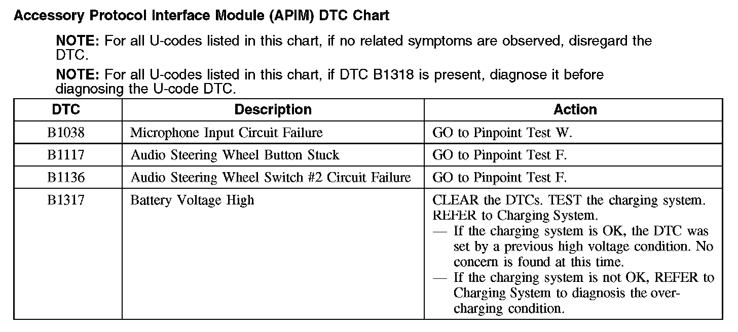 Accessory Protocol Interface Module (APIM) DTC Chart