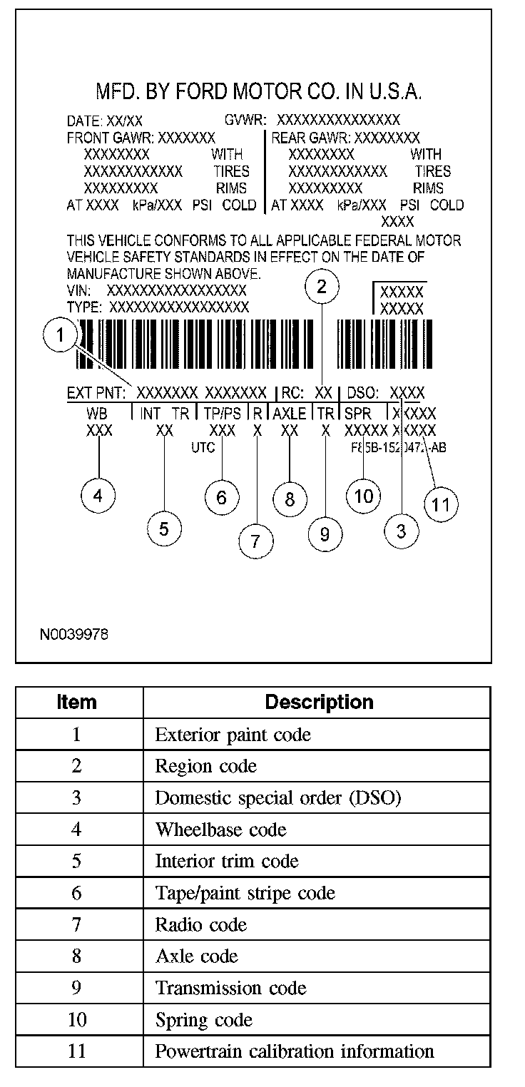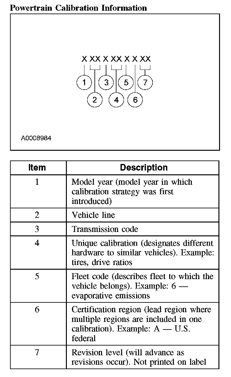 Powertrain calibration information is printed in the lower right corner of the VC label. Only base calibration information is printed. Revision levels will not appear, however, they can be found in OASIS.