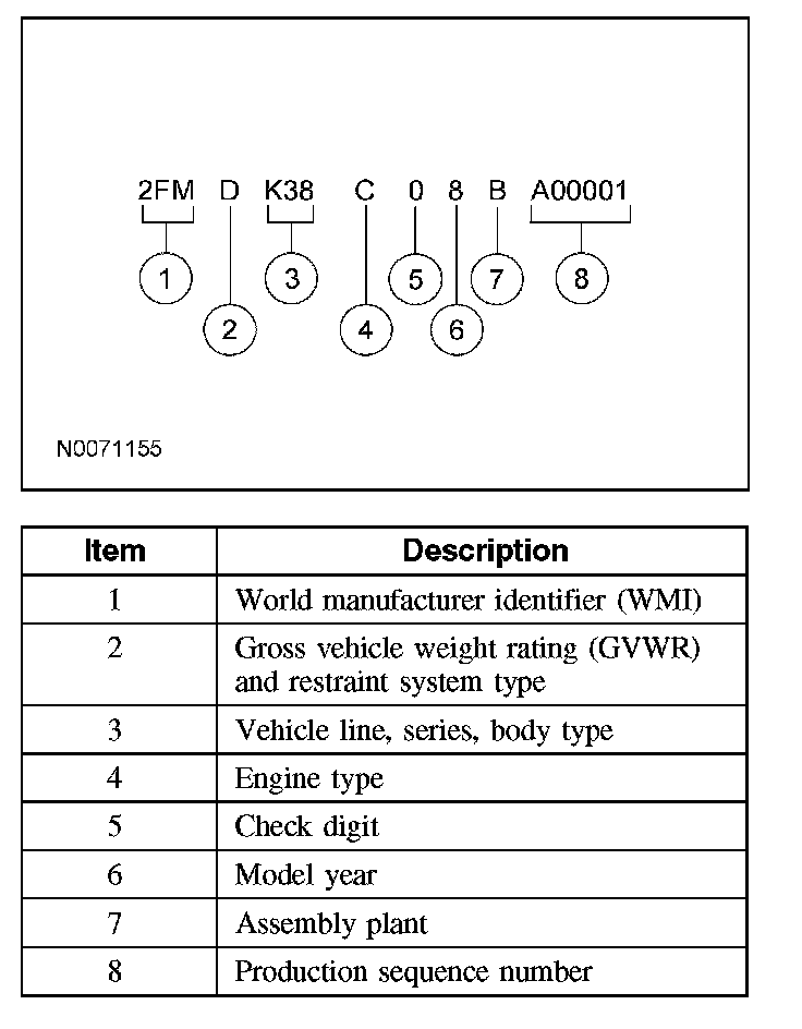 The vehicle identification number (VIN) is a 17-digit combination of letters and numbers. The VIN is stamped on a metal tab riveted on the instrument panel, top upper left of the dash. The VIN is also found on the vehicle certification (VC) label.