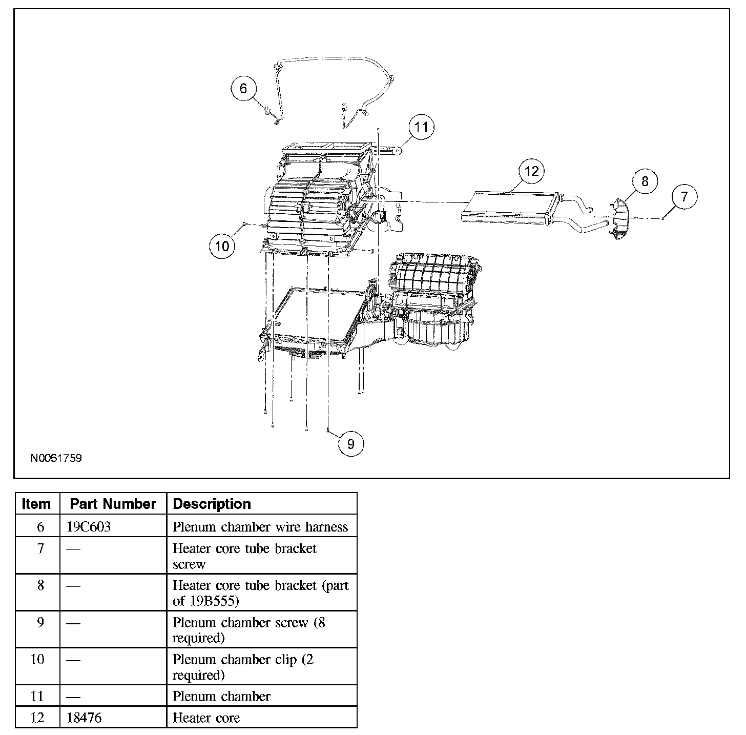 11. CAUTION: Do not handle the heater core by the inlet and/or outlet tube to remove. Handling the heater core by the tubes may damage the joints and lead to failure of the heater core.