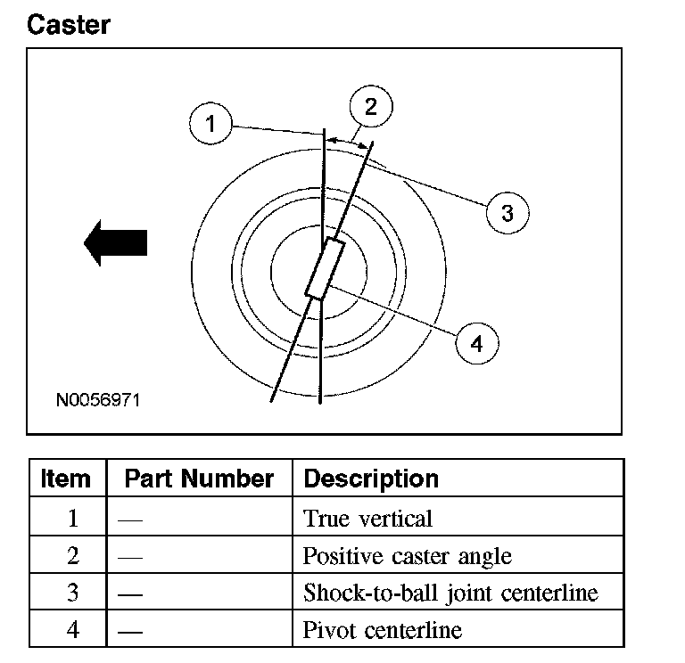 Caster is the deviation from vertical of an imaginary line drawn through the ball joints when viewed from the side. The caster specifications will give the vehicle the best directional stability characteristics when loaded and driven. The caster setting is not related to tire wear.
