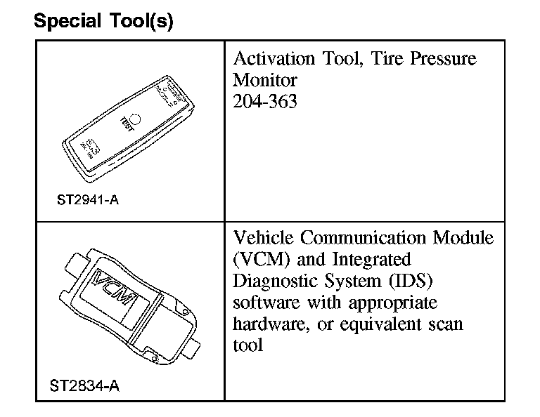 NOTE: If the vehicle has been stationary for more than 30 minutes, the sensors will go into a "sleep mode" to conserve battery power. It will be necessary to wake them up so they will transmit the latest tire pressure information to the smart junction box (SJB). For additional information, refer to Tire Pressure Monitoring System (TPMS) Sensor Activation. Tire Pressure Monitoring System (TPMS) Sensor Activation
